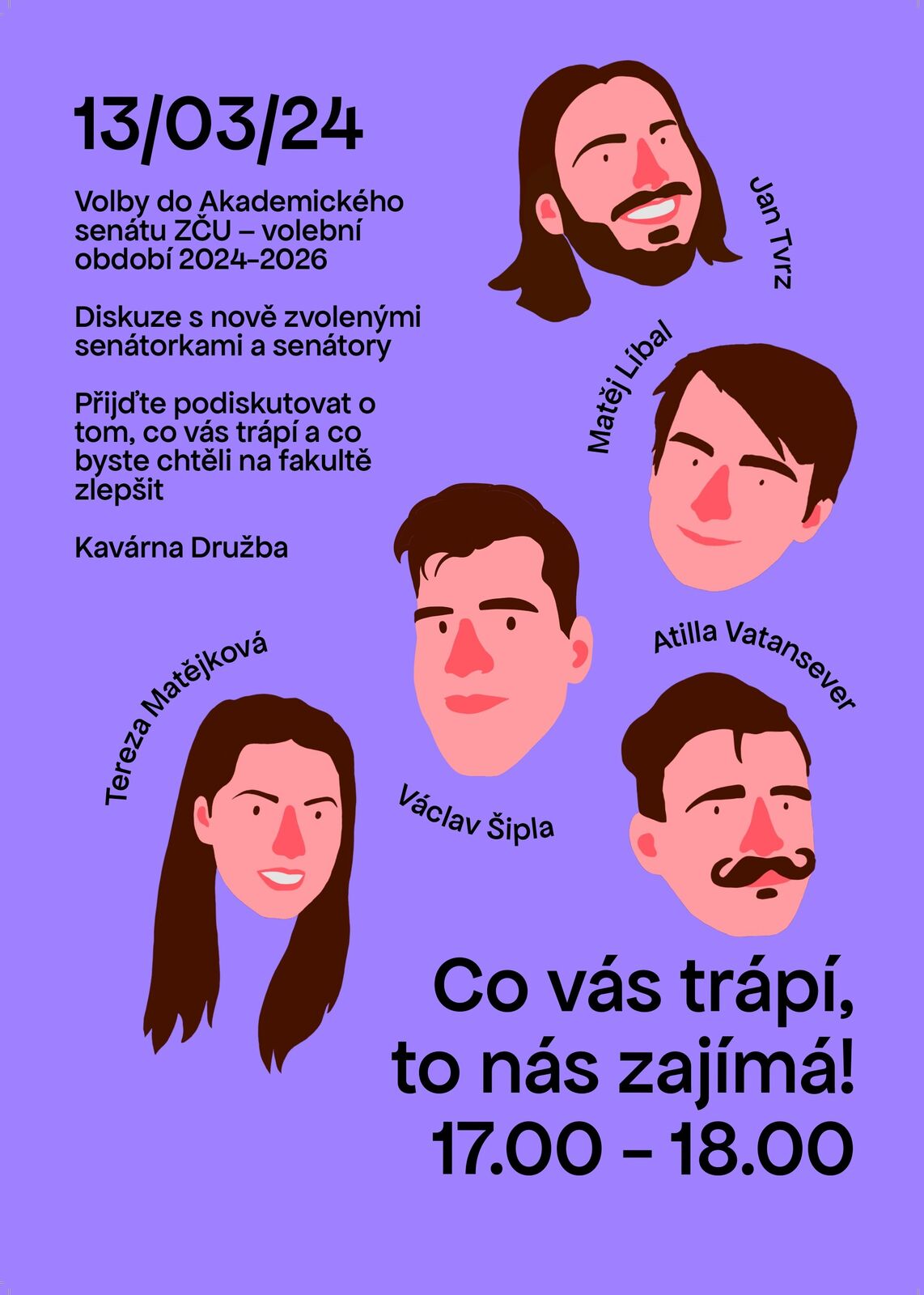 Srdečně zveme všechny studentky, studenty a zaměstnance Fakulty filozofické k neformálnímu setkání – Co vás trápí, to nás zajímá! Přijďte podiskutovat tentokrát s nově zvolenými senátorkami a senátory do velkého akademického senátu Západočeské univerzity a zeptejte se na to, co vás trápí a zajímá.