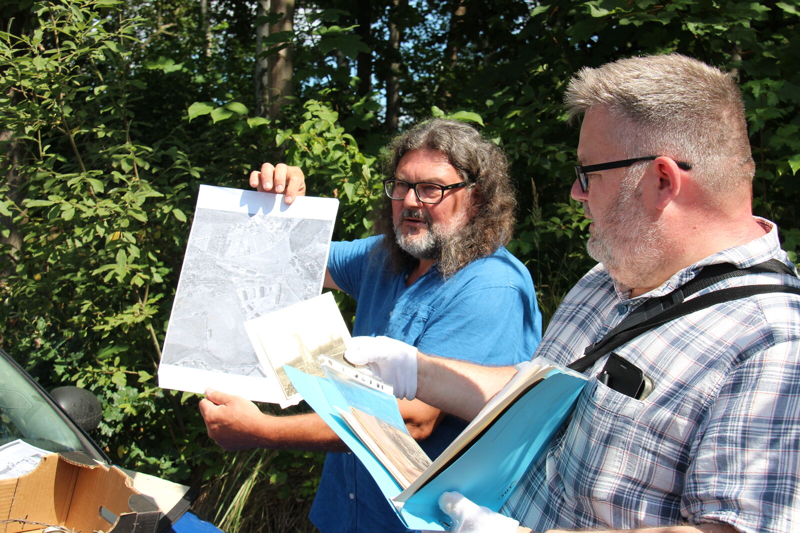 Pavel Vařeka and Michael Rund showing maps of the former Nazi concentration camp in Svatava.