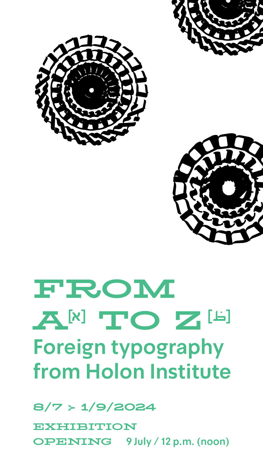 Druhá část výstavy nazvaná From A to Z představuje studentské práce z Holon Institute of Technology, jejichž cílem je vytvořit mezikulturní dialog prostřednictvím tvaru psaných písmen. Ve světě, který se neustále mění, se zdá, že jedna věc zůstává konstantní – můžeme vizuálně komunikovat, aniž bychom rozuměli slovu.