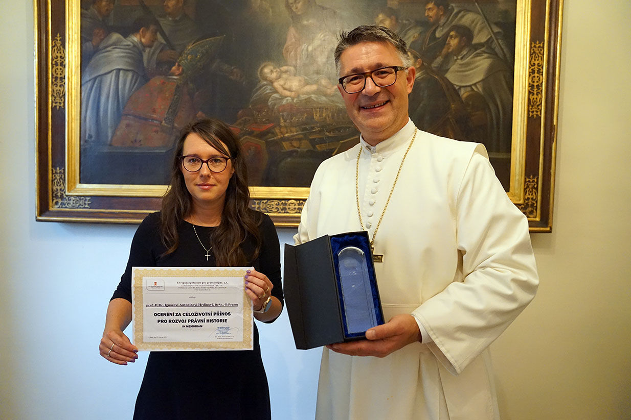 The leadership of the European Society for Legal History entrusted the award presentation to Alexandra Bejvančická, a long-time collaborator of Professor Hrdina and currently a doctoral student at the Faculty of Law at the University of West Bohemia. On behalf of her deceased colleague, the award was then received by the abbot Daniel Peter Janáček in the premises of the Royal Canonry of Premonstratensians at Strahov.