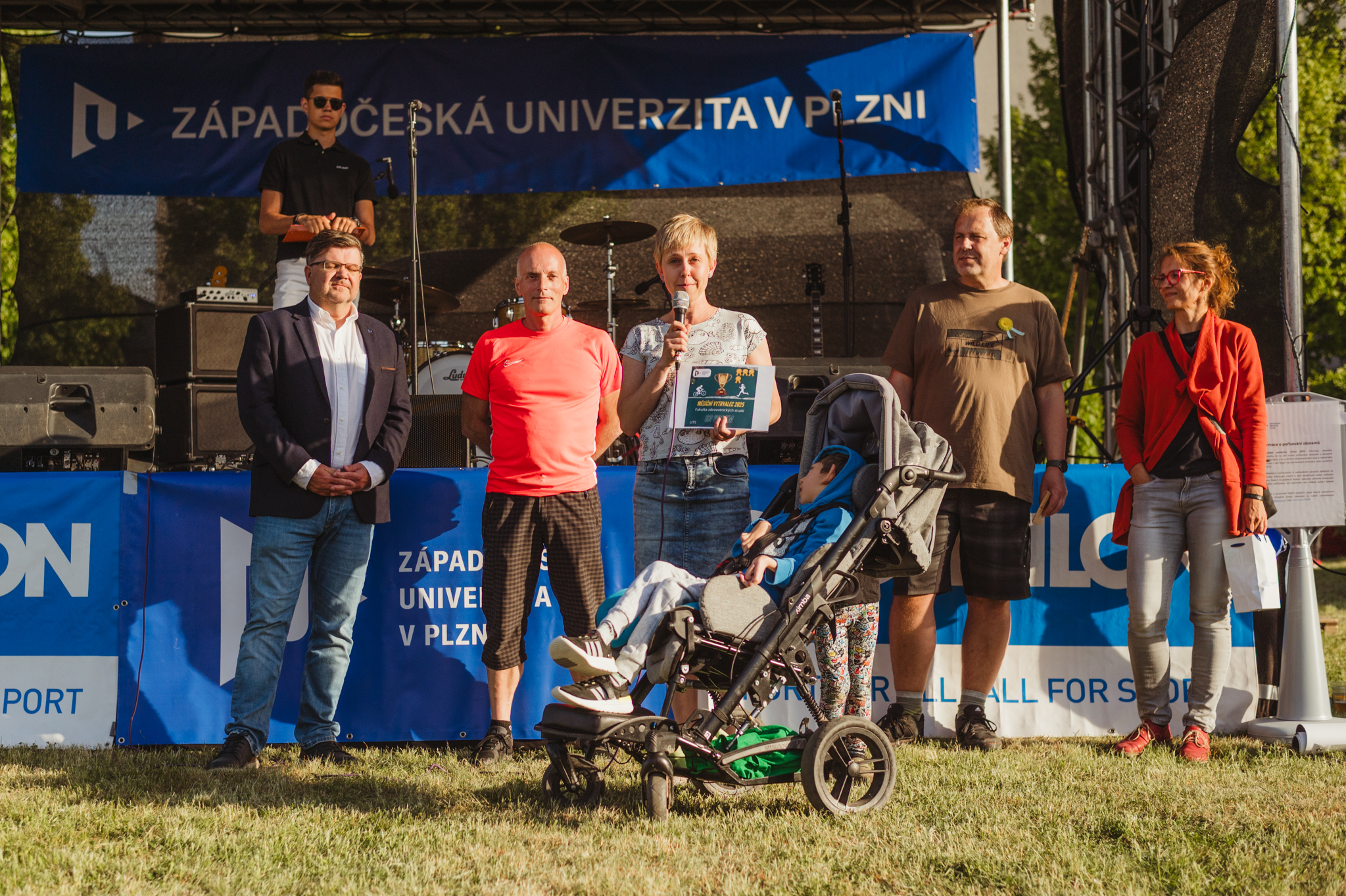 The evening also included the awarding of prizes - for example, for university-wide performances in the Monthly endurance race competition. Throughout the whole month of April, students and employees of UWB walked, ran or cycled more than 60 thousand kilometres. Every year the University supports someone in a difficult life situation with this competition. This year it was nine-year-old Vilém, who is completely immobile due to cerebral palsy caused by a malformation at birth. The exact number of kilometres walked was converted into money and this year's proceeds to help little Vilém amounted to 62 281 crowns. Vilém and his mother, a graduate of the Faculty of Education of UWB, thanked the athletes on the podium and received the cheque from rector Miroslav Lávička and dean of the Faculty of Health Care Studies Jiří Frei: "Thank you all very much. We are very grateful to all of you, you have moved not only your bodies, but also your hearts."