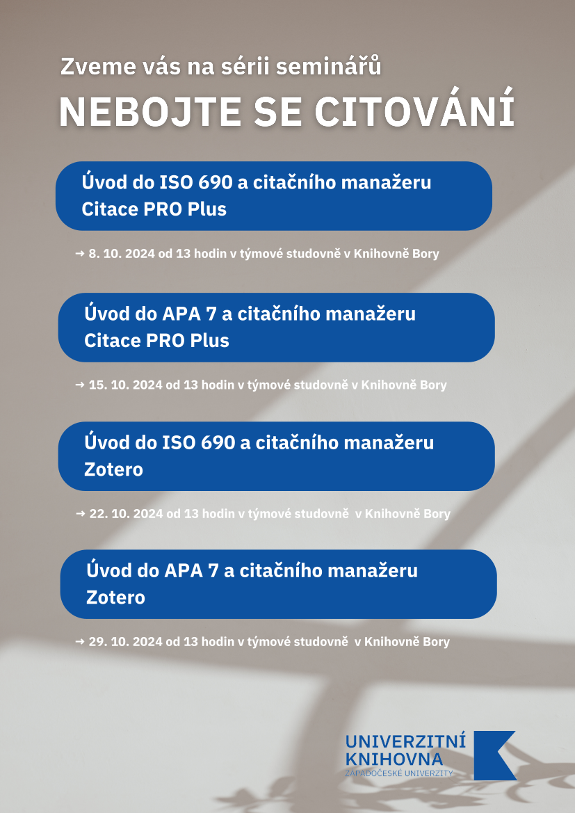 Univerzitní knihovna Západočeské univerzity v Plzni si pro vás připravila sérii seminářů o citování, které vám pomohou nejen zvládnout základy, ale také získat jistotu při práci s různými druhy zdrojů. Už žádný stres z formátování nebo nekonečné úpravy na poslední chvíli!