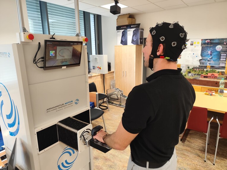 V reálném čase rozpozná záměr, že se člověk s poruchou hybnosti u horních končetin chystá pohnout a pomůže mu rehabilitovat. Takový systém vyvinul Tomáš Kment, dnes už absolvent Fakulty aplikovaných věd ZČU v Plzni (FAV), který si téma vybral pro svoji diplomovou práci. Systém zpracovává EEG signály, na jejichž základě komunikuje s robotickou paží, jak ve virtuální realitě, tak v počítačové aplikaci. Software pro neurorehabilitaci na míru může pomoci v léčbě pacientů s poraněním nervové soustavy, Parkinsonovou chorobou a dalšími neurologickými onemocněními.
