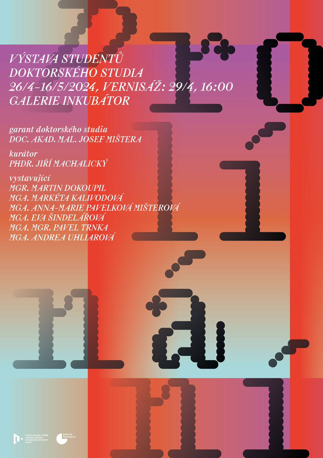 Vystavující: Martin Dokoupil, Markéta Kalivodová, Anna-Marie Pavelková Mišterová, Eva Šindelářová, Pavel Trnka, Andrea Uhliarová