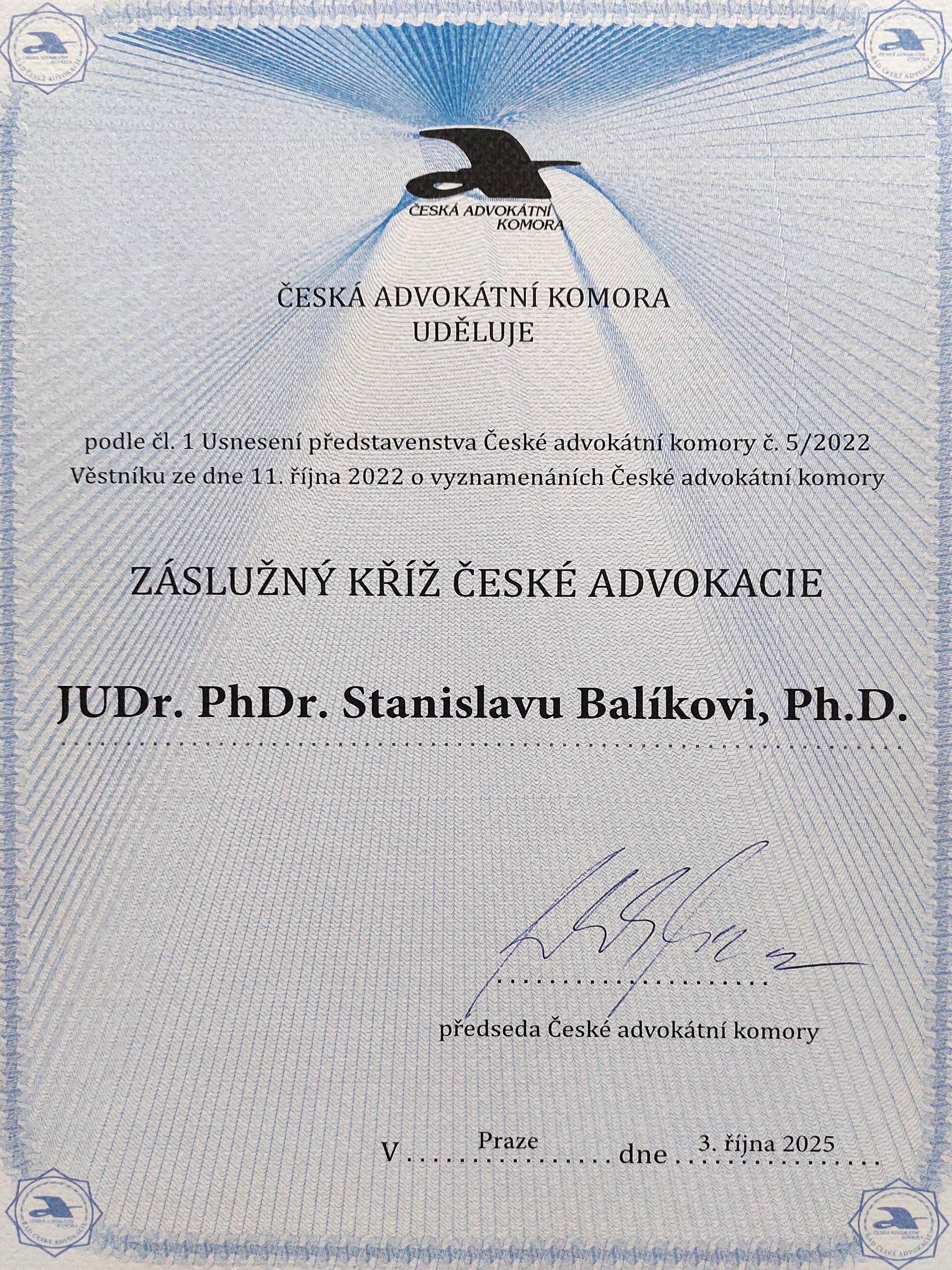 The Dean of the Faculty of Law of the University of West Bohemia in Pilsen, Stanislav Balík, was awarded the Cross of Merit of the Czech Bar Association (CBA) at the 9th Assembly of the Czech Bar Association (ČAK). As stated by the Czech Bar Association: "The award belongs to him as a long-time official of the Chamber and former chairman of the Czech Bar Association from 2002 to 2003. A long-time examiner and lecturer who focuses on the young generation of lawyers. An important legal historian who has been mapping the history of the legal profession in the Czech lands for a long time, including by organizing regular conferences on the history of the legal profession."