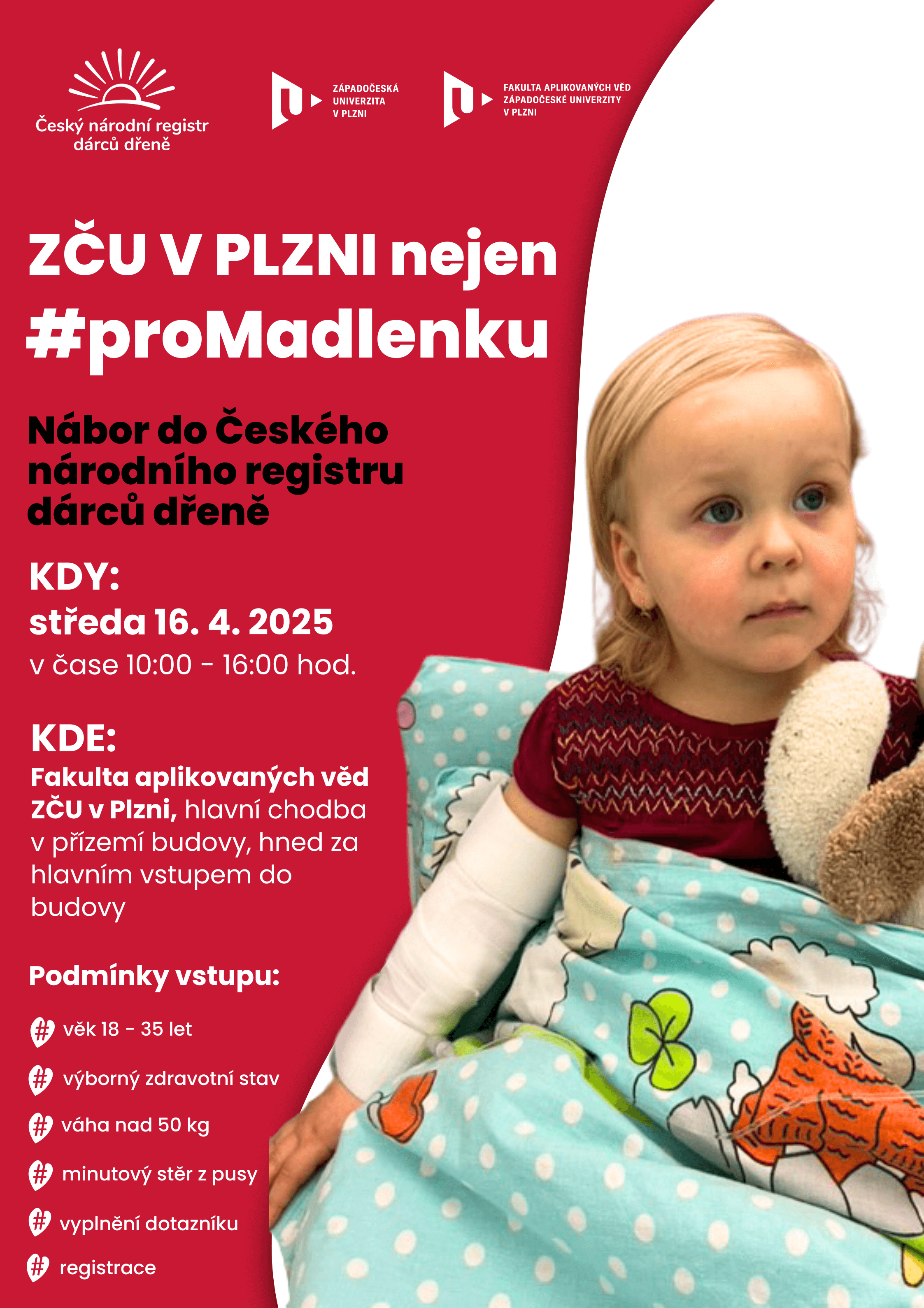 "A wave of solidarity is spreading through the Czech Republic. A touching video of the father of the sick two-year-old Madlen triggered people's interest in registering for the CNRDD. A huge wave of support arose after posting his appeal on social networks. Thousands of people decided to join the registry to help and give hope not only to little Madlen but also to other patients who are waiting for their donor," said Lucie Houdová from the Faculty of Applied Sciences of the University of West Bohemia in Pilsen, where a registration point for recruiting bone marrow donors will be set up on 16 April.