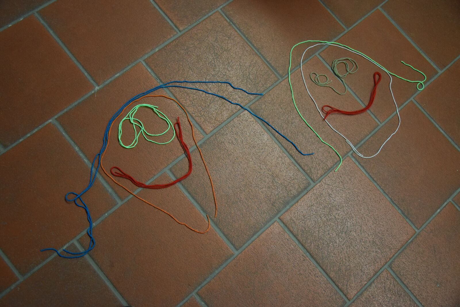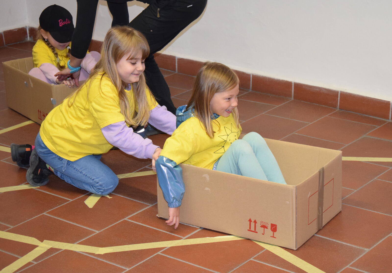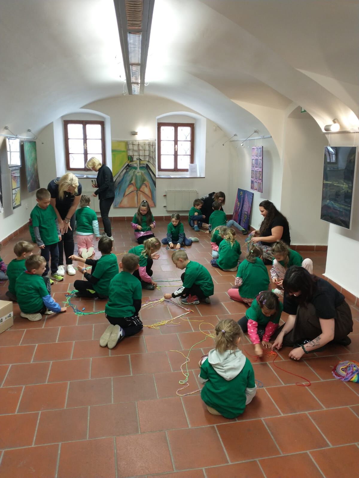 On June 11th, forty children from the Rokycany Kindergarten at U Saské brány, accompanied by their director Věra Zagorová, visited the exhibition. The gallery education was prepared by students from the Department of Art Education and Culture in collaboration with teacher Lucie Brabcová. The goal was to offer the children 45 minutes of intensive experiential pedagogy directly in the gallery. The children created images on the gallery’s brick floor using colorful wool, connected them into a large maze, and kept micro-robots in the form of vibrating beetles within the boundaries of the images. Inspired by the students' artworks, they subsequently transformed the gallery space into a highway, a labyrinth of roads, and moving boxes became cars with which they set out on a journey.