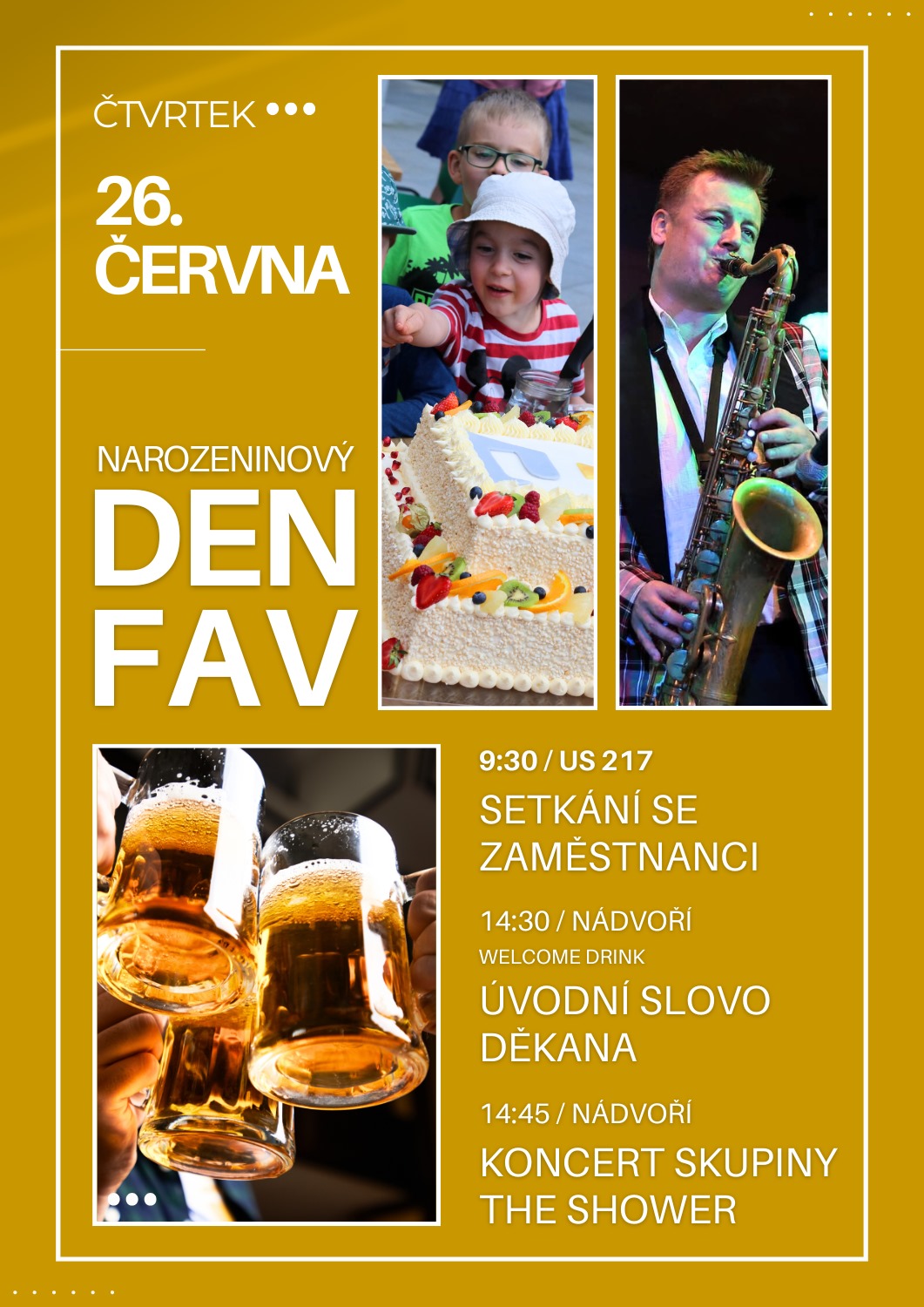 Tradiční narozeninový Den FAV ZČU je určen nejen stávajícím zaměstnancům fakulty. Vítáni jsou i kolegyně a kolegové z dalších pracovišť ZČU, studující a absolventy nevyjímaje. Po úvodním slově děkana FAV Miloše Železného zahraje skupina The Shower, která má v repertoáru především hity 50. a 60. let. Po celou dobu konání akce si hosté budou moci zakoupit jídlo i pití u přistaveného cateringového stánku Pivovaru Ostrov.