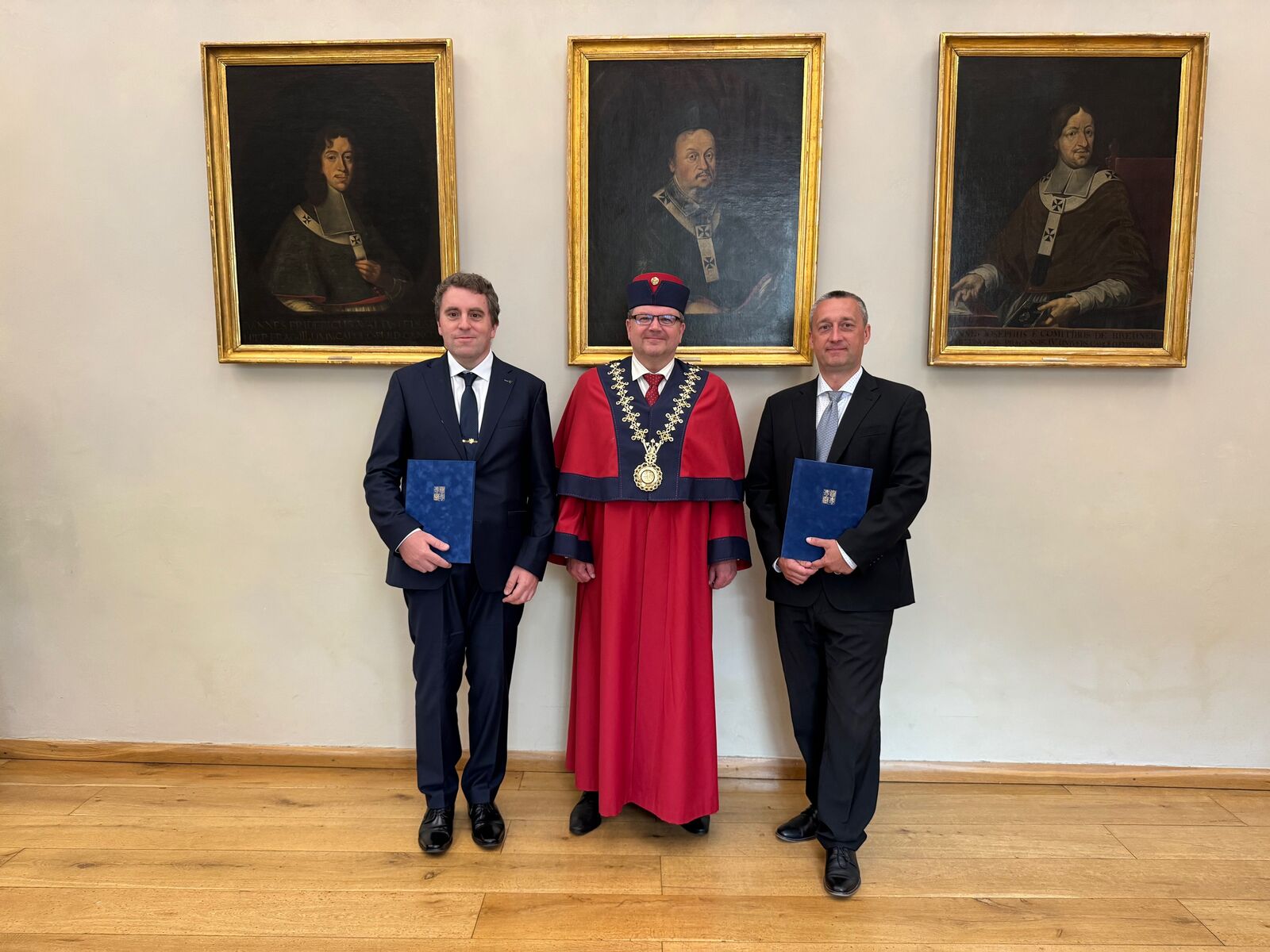 Oficiální fotka z předáváním jmenovacích dekretů: Jiří Houška, rektor ZČU Miroslav Lávička, Miroslav Zetek