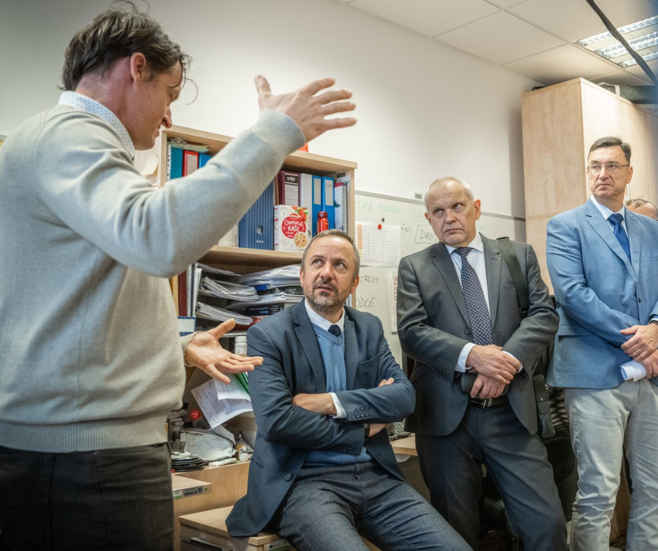 The Minister for Science, Research and Innovation Marek Ženíšek visited on Thursday 7 November, the Faculty of Applied Sciences together with the MP Miloš Nový and the representative of the Pilsen Region Richard Pikner. Experts from the Department of Cybernetics and the NTIS research centre presented them the results of research, which is mainly related to health care. The delegation was welcomed by the Dean of the Faculty Miloš Železný, the Director of the NTIS Research Centre Pavel Novák and the Head of the Department of Cybernetics Vlasta Radová. During the excursion, the topic of research funding and support for further research activities was also raised. Pavel Novák highlighted the success of the teams in attracting projects, thanks to which it is possible to secure financial support for quality research.