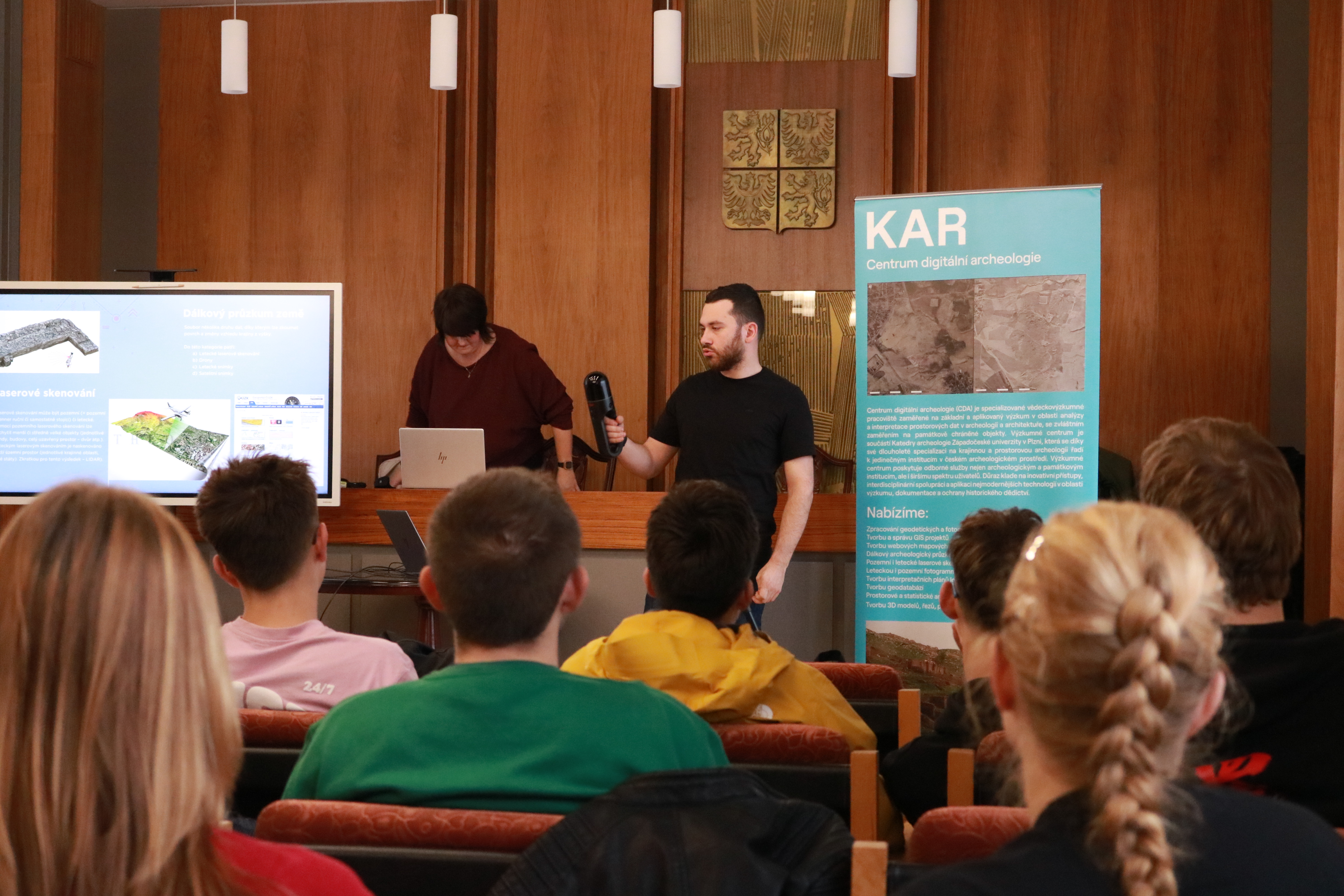 The second part of the day was held at the Starý Plzenec Town Hall, where archaeologists demonstrated how the collected data are processed. The students observed the creation of 3D models, orthophoto maps, and the results of laser scanning and reconstruction modeling. Presentations were prepared not only by staff from the Centre for Digital Archaeology but also by PhD students from the Department of Archaeology who use digital methods in their research.
