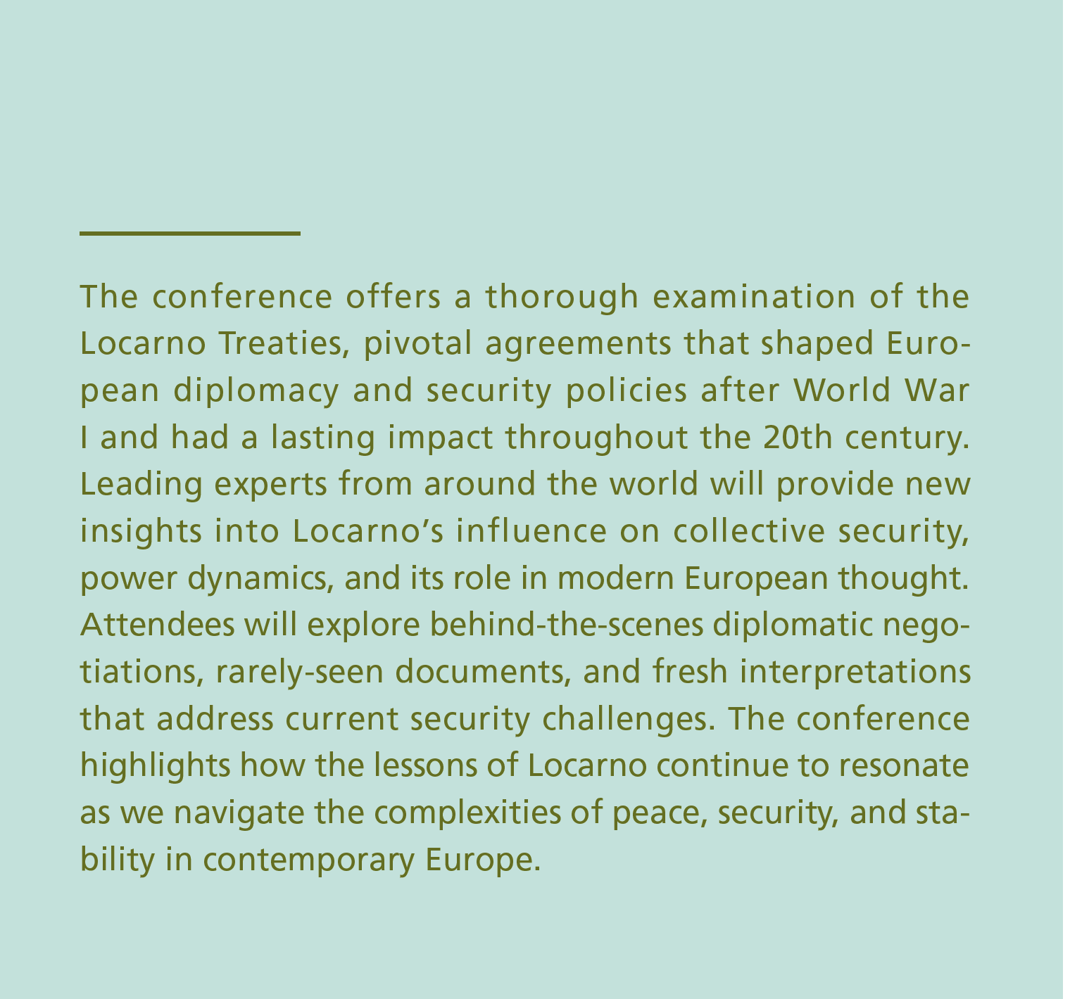 The conference offers a thorough examination of the Locarno Treaties, pivotal agreements that shaped European diplomacy and security policies after World War I and had a lasting impact throughout the 20th century. Leading experts from around the world will provide new insights into Locarno´s influence on collective security, power dynamics, and its role in modern European thought. Attendees will explore behind-the-scenes diplomatic negotiations, rarely-seen documents, and fresh interpretations that address current security challenges.