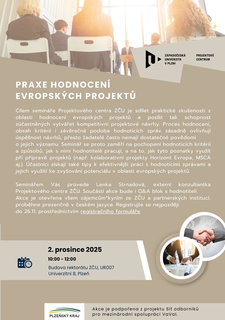 Sdílení praktických zkušeností z oblasti hodnocení evropských projektů a posílení schopnosti zúčastněných vytvářet konkurenceschopné projektové návrhy jsou hlavní cíle semináře Projektového centra ZČU. Proces hodnocení, obsah kritérií i závěrečná podoba hodnoticích zpráv zásadně ovlivňují úspěšnost návrhů, přesto žadatelé často nemají dostatečné povědomí o jejich významu.