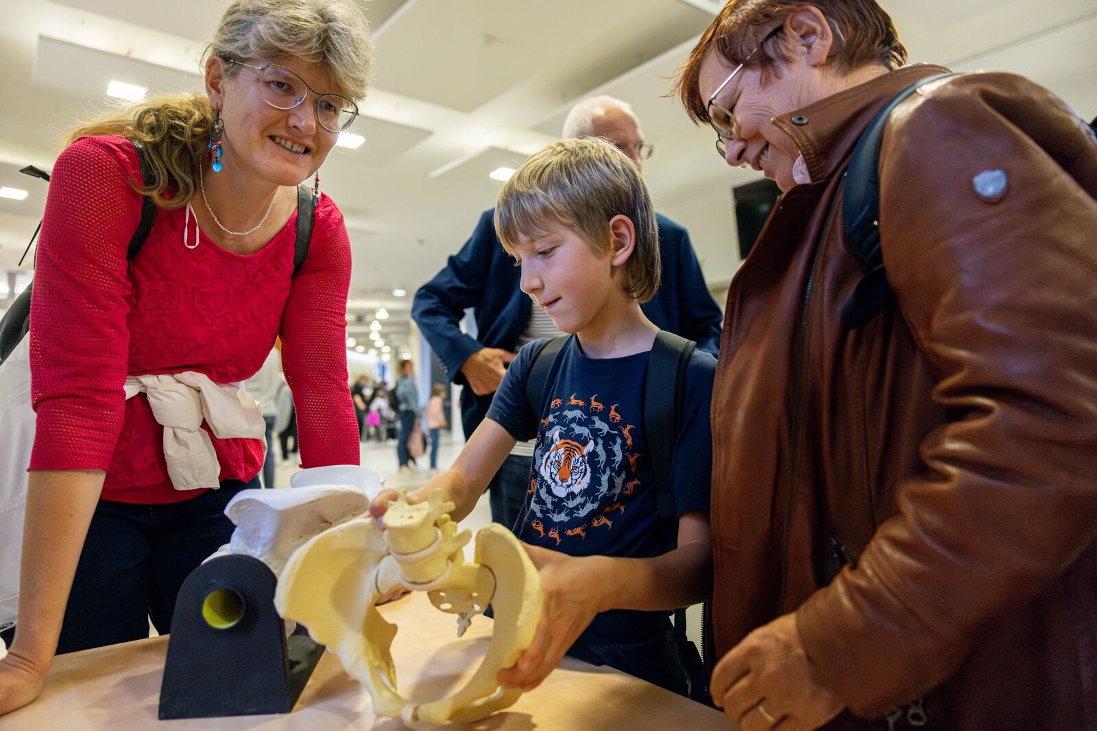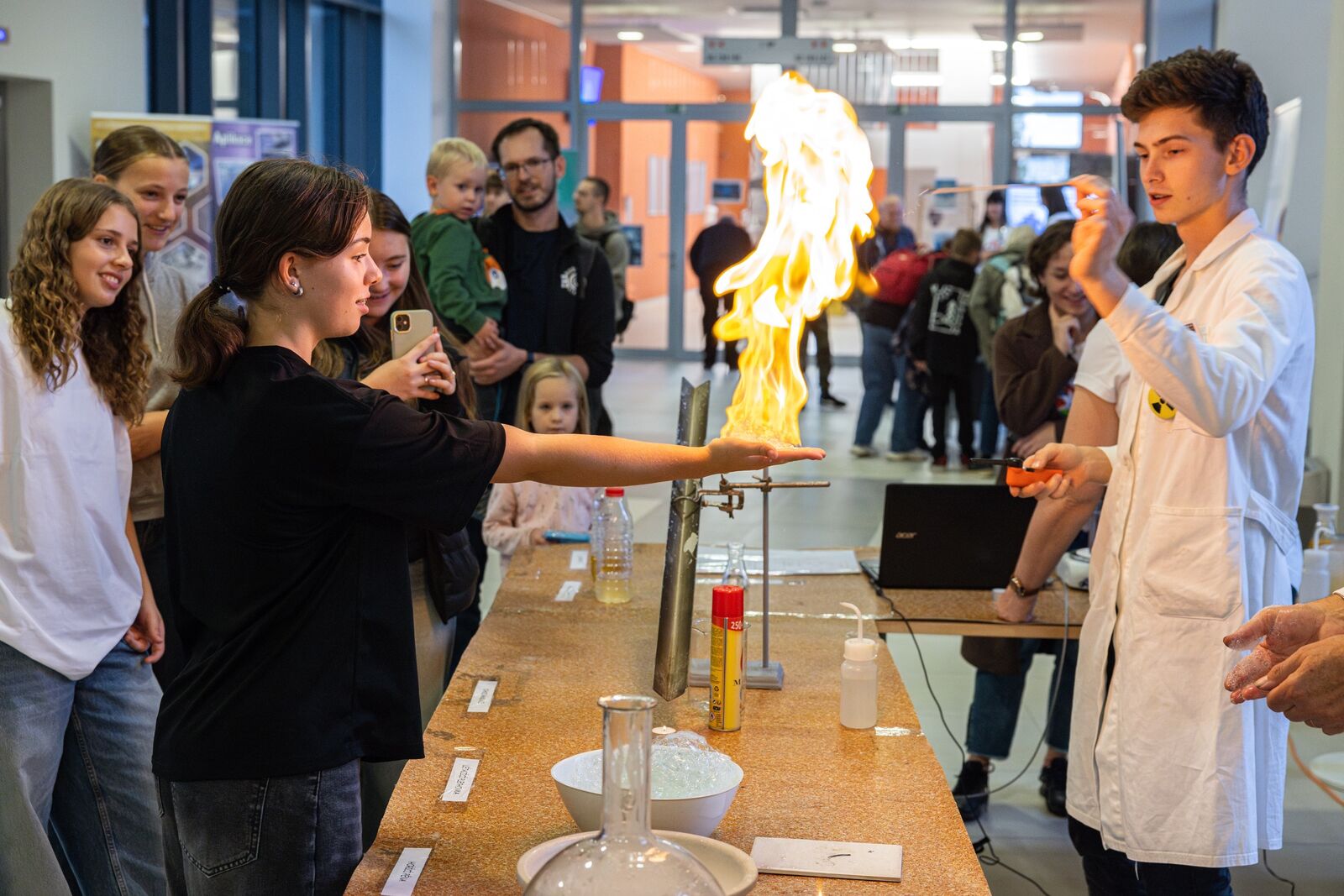 „Nám se zatím nejvíc líbil asi ten suchý led," prozradila mladá návštěvnice, kterou doplnil drobnou připomínkou její otec: „Je to tady zajímavé, líbí se mi tu, jen bych za sebe osobně uvítal větší systematičnost. Jednotlivé expozice mi připadají nahodile rozmístěné." Malý Jáchym si pochvaloval expozici Fakulty zdravotnických studií (FZS), kde si zkoušel resuscitaci na figuríně. „Já jsem tady na rozdíl od Jáchyma letos poprvé. Teď jsme začali a hodláme projít všechny expozice. Nejvíc mě zajímá videomapping," sdělil doprovod malého návštěvníka a dalších dvou přibližně stejně starých návštěvnic.