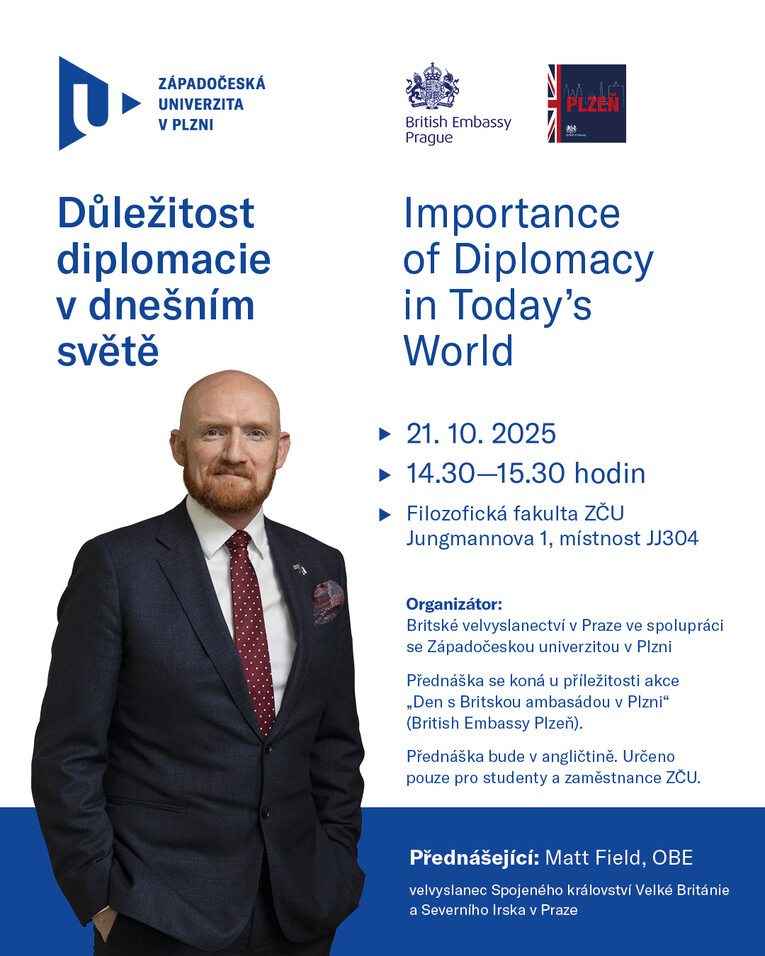 Na Západočeskou univerzitu v Plzni zavítá v úterý 21. října britský velvyslanec Matthew Robert Field OBE. Studujícím ZČU přiblíží téma mezinárodních vztahů a diplomacie.
