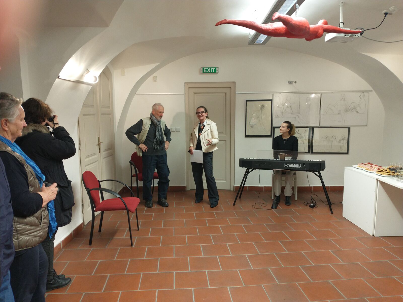 Although Kurt Gebauer is mainly known for his work in public space and sculpture, the exhibition in Pilsen presents mainly his drawings and paintings. For Kurt Gebauer, water is a subject he has been dealing with for a long time. Swimming in the open air, in the pool, in the sauna and moving by the water gives space to see a person more natural and free than in everyday life. Kurt Gebauer is a swimmer, an activist for the preservation of beautiful places and, above all, an observer for whom being by the water offers a plethora of possibilities to see man free from earthly attraction. In the Gallery of the European House of the SVK PK, sculptures float as if they were in the water, paintings of floating figures hang on the walls, accompanied by drawings from the hot sauna, which contrast with the freezing cold of winter.