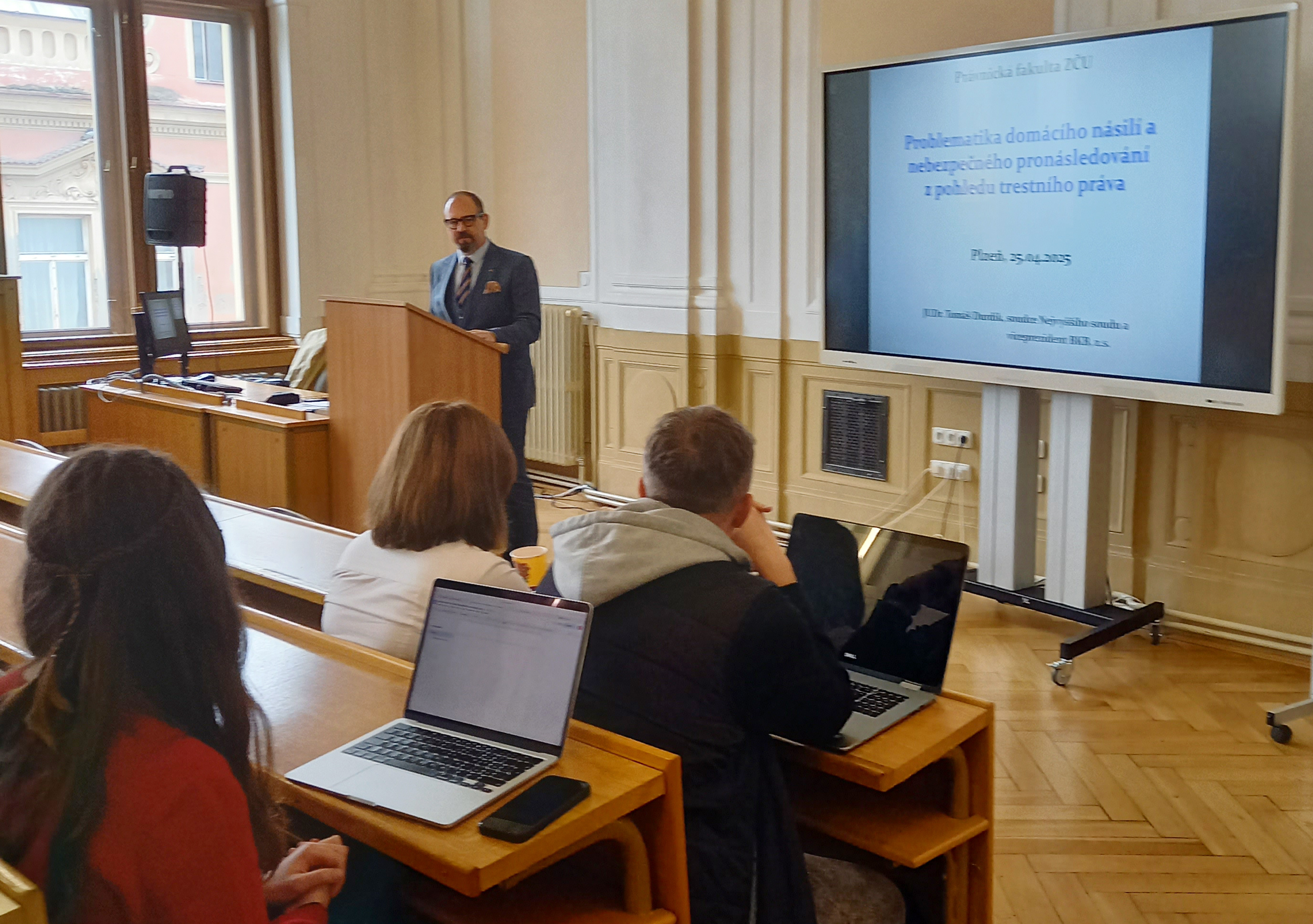 První přednáška se zaměřila na trestný čin domácího násilí, nebezpečný stalking a obecnou ochranu osobních práv a svobod. „Těmto tématům se dnes věnuje stále větší pozornost, a to i v souvislosti s chystanou legislativní změnou,“ upozornil Durdík. Měl na mysli návrh zákona o domácím násilí, který vláda schválila v loňském roce. Nová legislativa má za cíl posílit ochranu obětí, sjednotit přístup soudů a institucí a zajistit rychlou a efektivní pomoc těm, kteří ji potřebují.