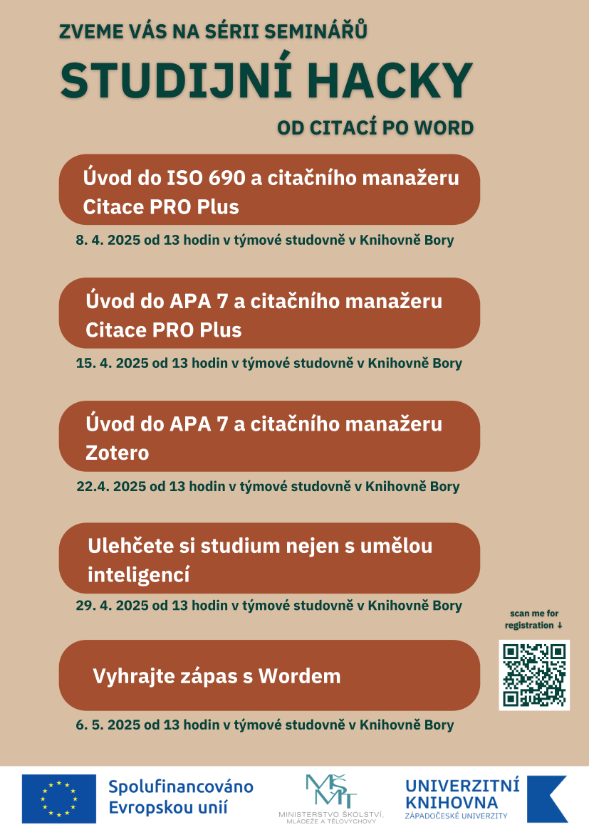 Jedná se o první přednášku ze série seminářů „Studijní hacky – od citací po Word“, které jsou spolufinancovány Evropskou unií a Ministerstvem školství, mládeže a tělovýchovy České republiky.