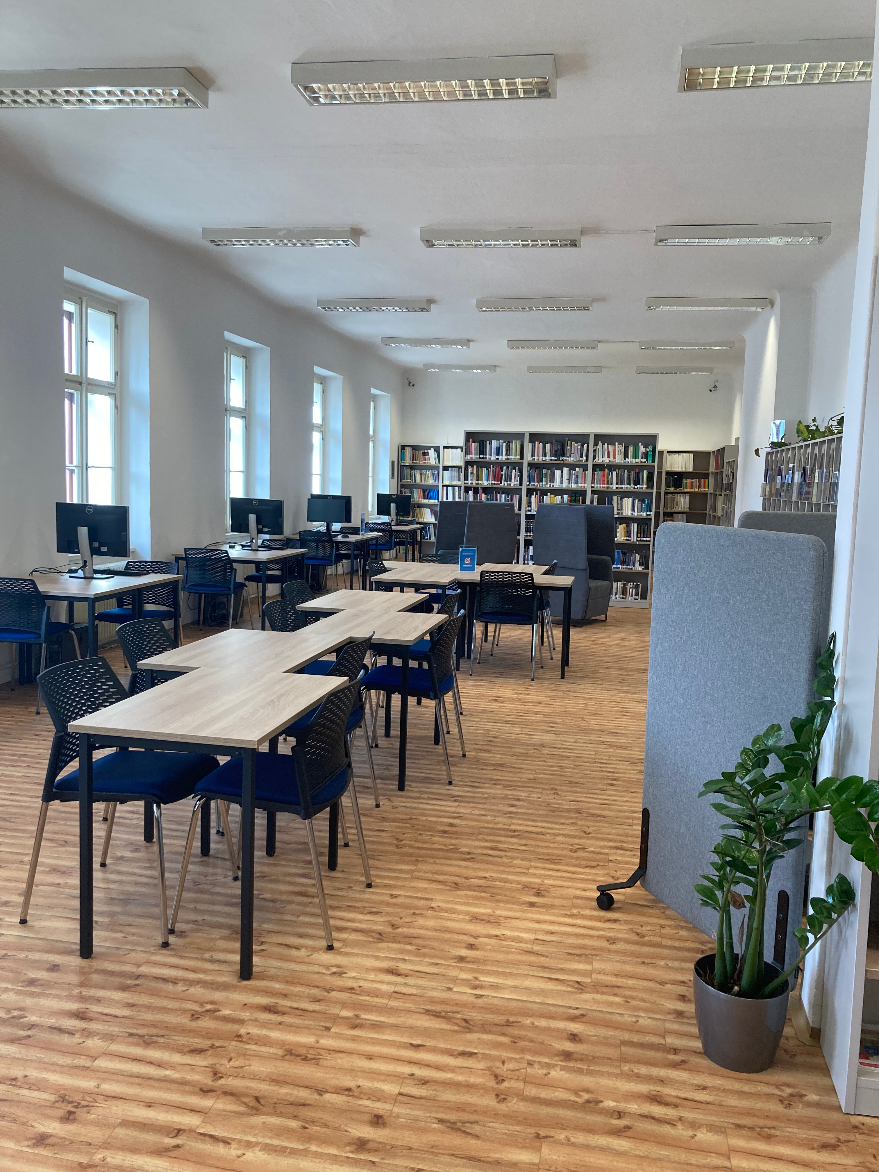 In January of this year, the library had to be out of commission to allow for a complete replacement of the free-choice equipment on the third floor. As a result, visitors can now enjoy new bookshelves, study tables, acoustic chairs, seating bags and mobile screens. It is the acoustic chairs that provide greater privacy and quiet for working or reading, thanks to the high side walls at head level that absorb sound.