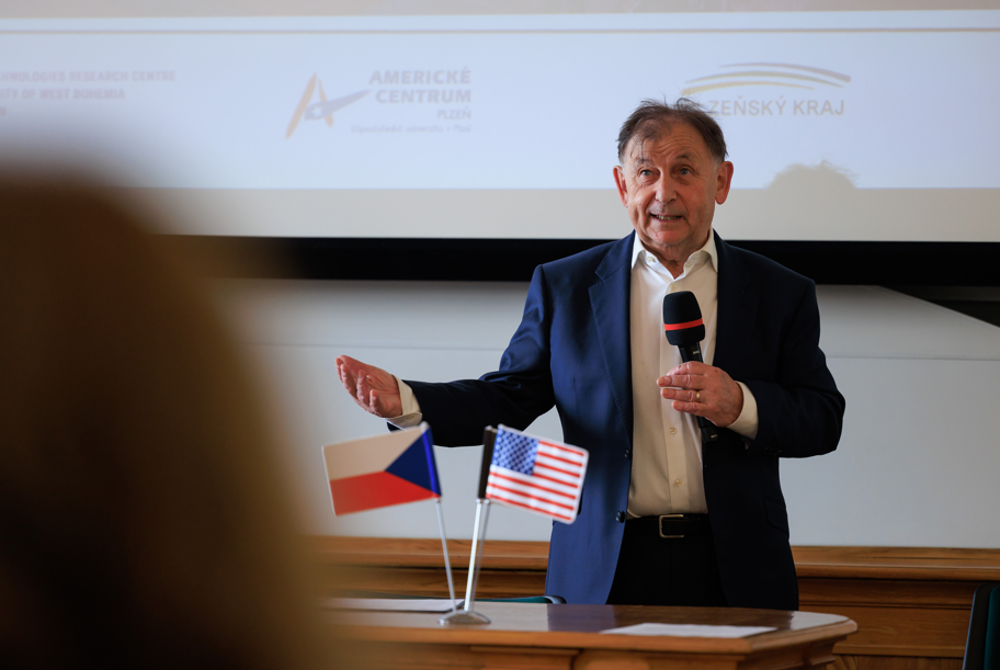The event was opened by journalist Pavlína Horáková, followed by a keynote lecture from historian Dr. Roman Kodet of UWB’s Faculty of Arts. He outlined key moments of World War II, including the role of the Škoda armaments factory, the liberation of Pilsen by American and Belgian troops, and symbols still honoring U.S. soldiers today, such as the Native American logo on the Škoda Plzeň hockey team jerseys.