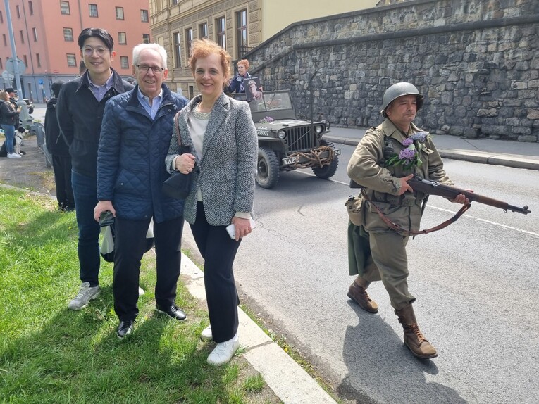 Costas Chassapis, Cristina Comaniciu, and Joe Huang during the visit to the Liberation Festival in Pilsen marking the 80th anniversary of the city's liberation.