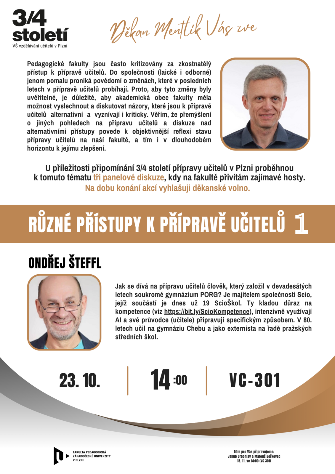 U příležitosti připomínání 3/4 století přípravy učitelů v Plzni proběhnou Na Fakultě pedagogické tři panelové diskuze. Hostem první z nich je pan Ondřej Šteffl.