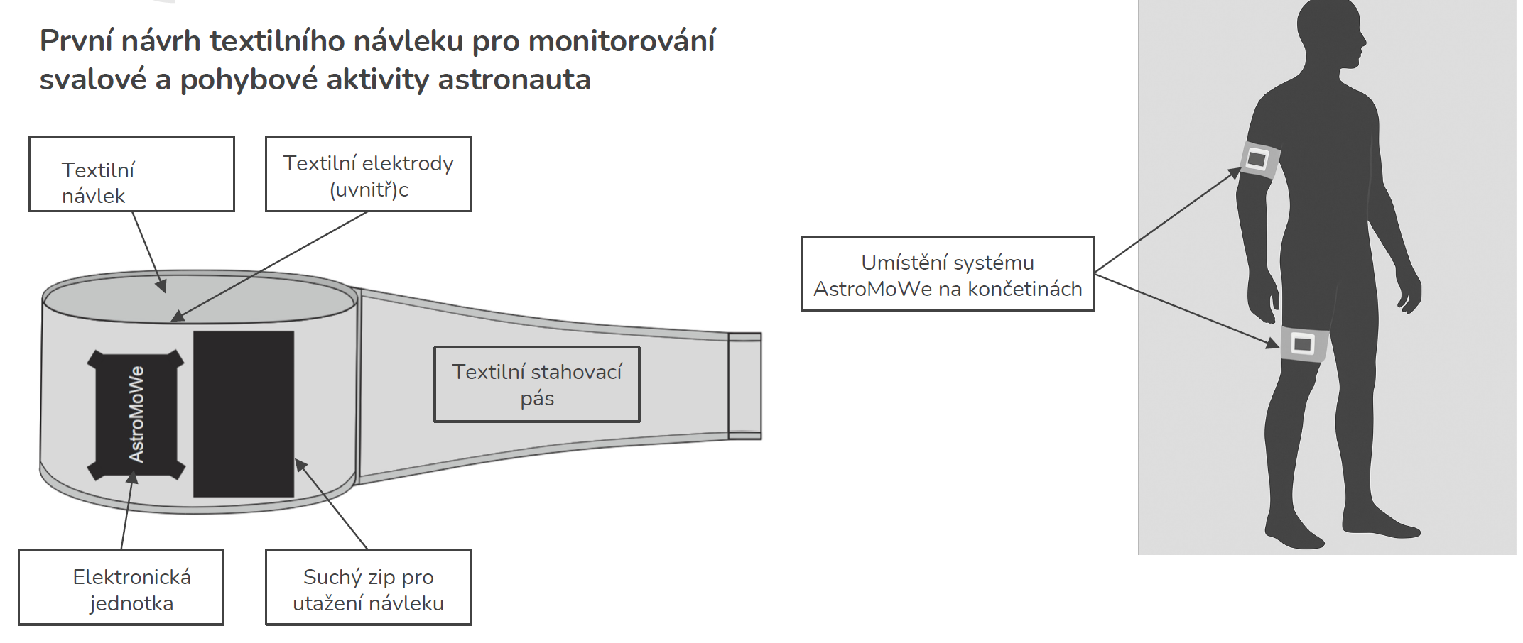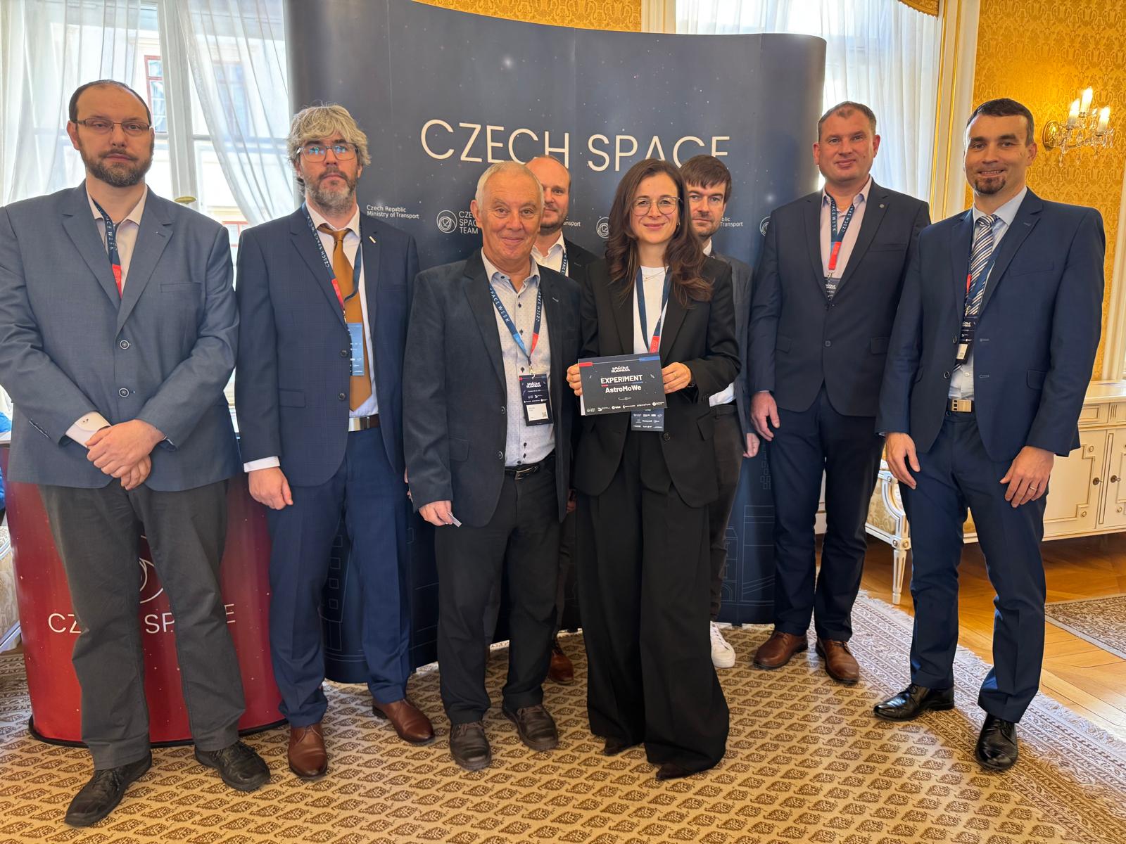 The AstroMoWe experiment (Astronaut Muscle and Movement Wearable Monitoring System) was developed in collaboration with the European Space Agency (ESA). The research team presented it to the public on October 21, 2025, at a press conference during Czech Space Week in Liechtenstein Palace in Prague. Project partners include CTU (main coordinator), UWB (textile electrode development), VÚB a. s. (textile materials), and the Brno-based company G. L. Electronic s. r. o. (electronics manufacturing and clean-room testing).