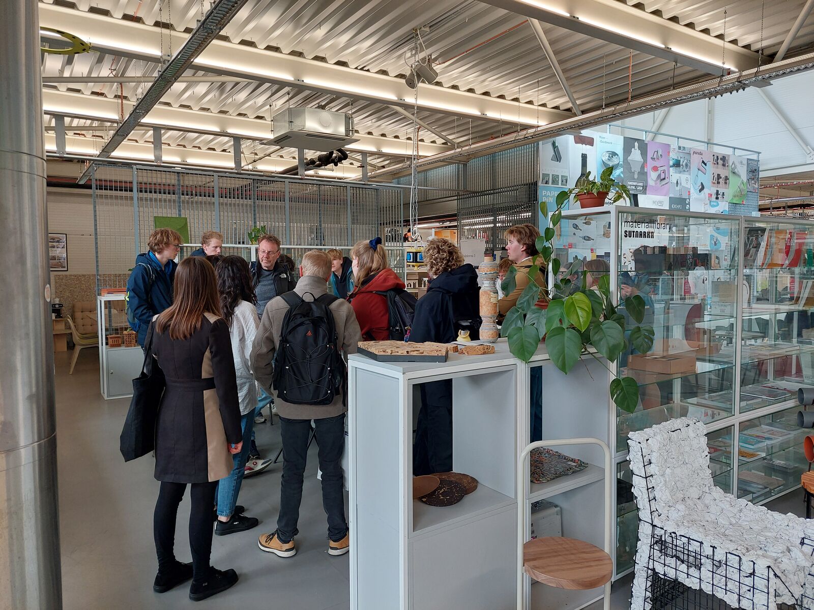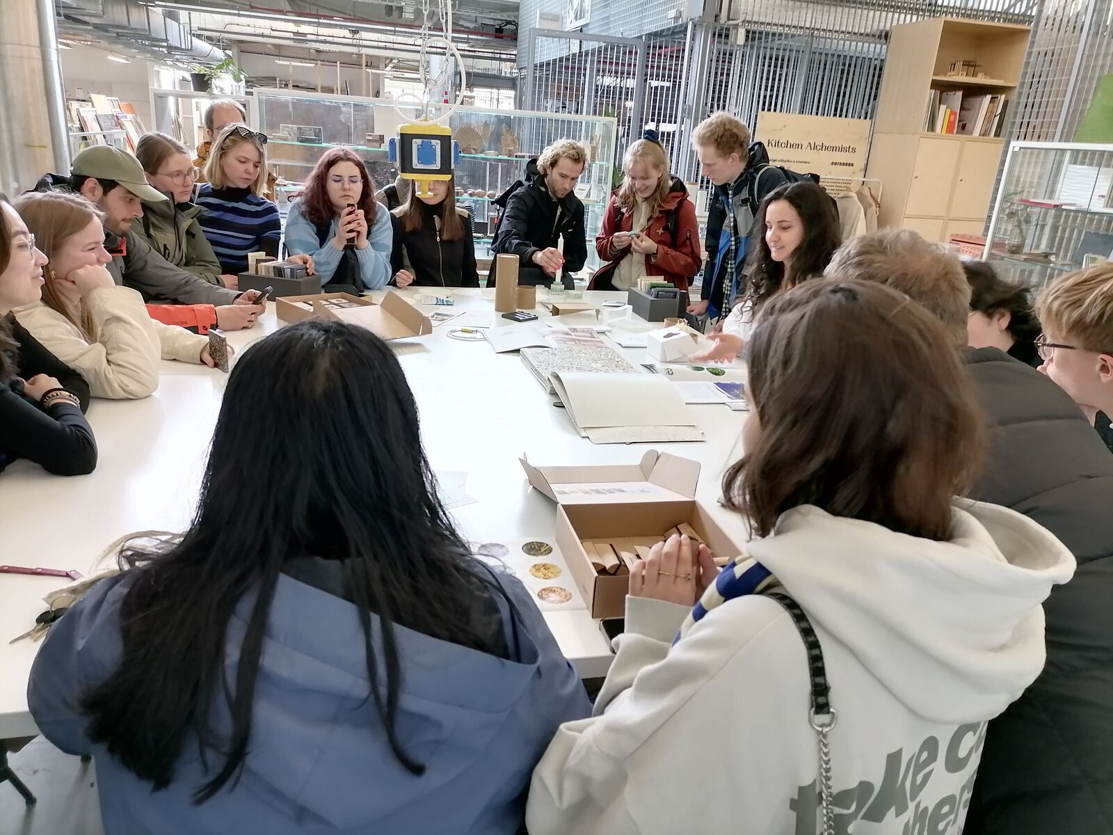 Po obědě v univerzitní menze hosté navštívili budovu Fakulty designu a umění Ladislava Sutnara, kde za výkladu proděkanky pro tvůrčí činnost Jany Potiron a její doktorandky Kristiny Zejkanové sledovali studující umění přímo v akci a diskutovali o udržitelnosti při práci s různými materiály.