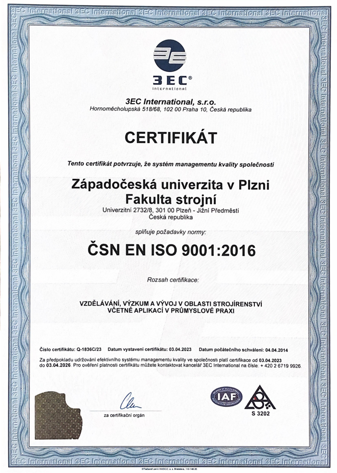 The Faculty of Mechanical Engineering was first certified according to the international standard ISO 9001:2015 in April 2014. Even after 10 years since implementing this quality system, the faculty continues to successfully defend its certification.