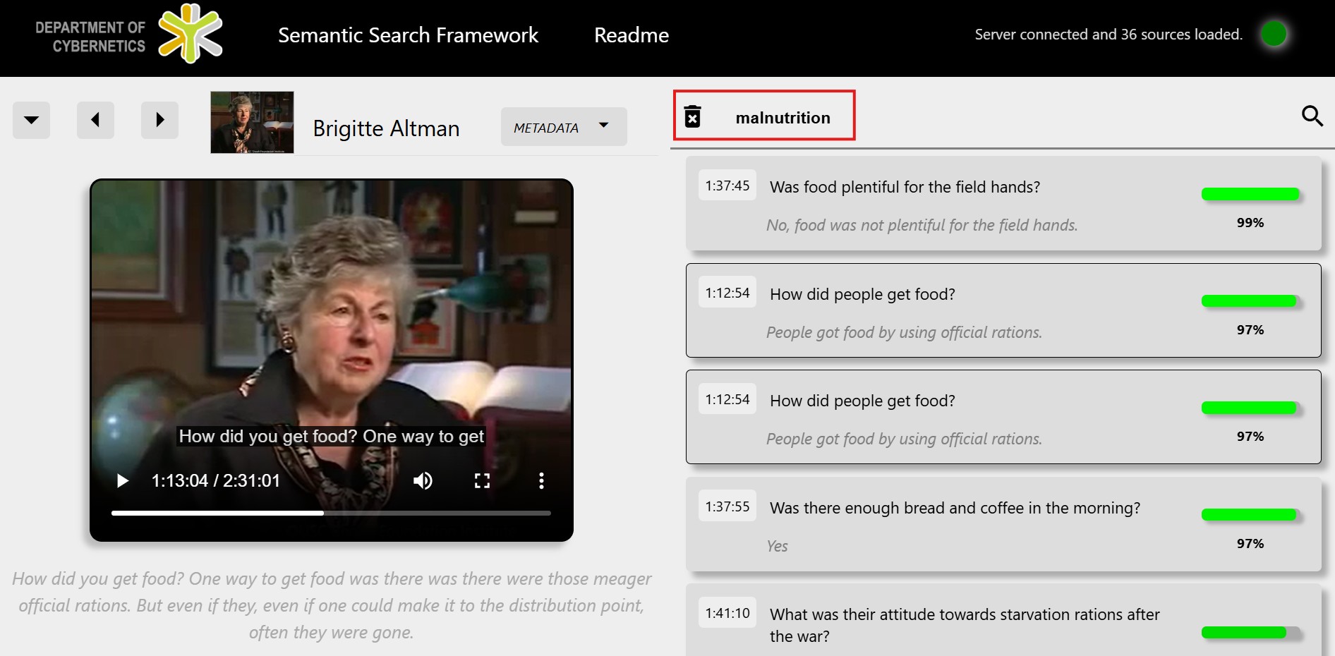 Ukázka vyhledávání v aplikaci. Při zadání dotazu malnutrition aplikace hledá zmínky o jídle a hladovění.
