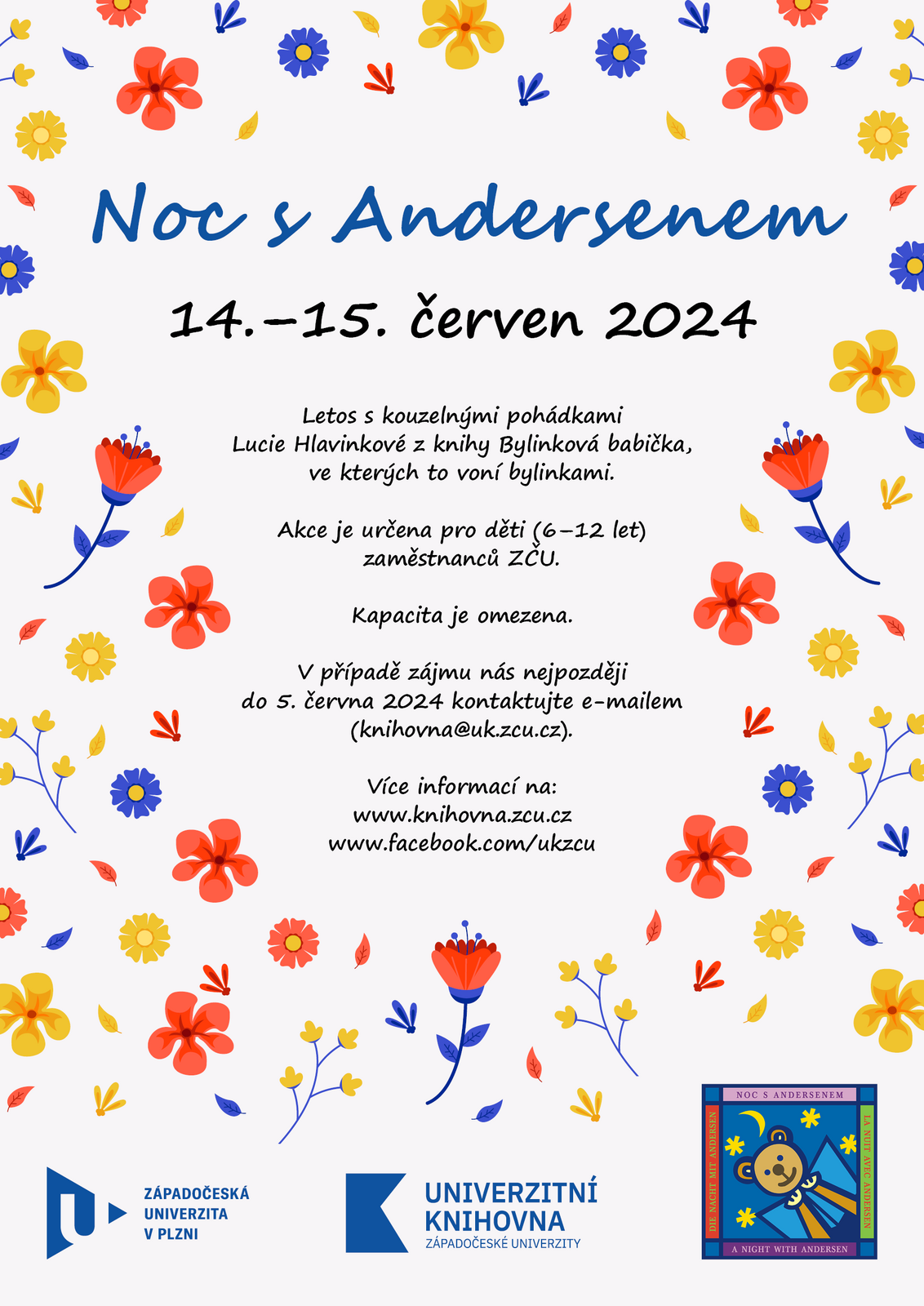 Noc s Andersenem se na Západočeské univerzitě v Plzni pořádá na podporu dětského čtenářství letos už poosmé. V uplynulých letech děti navštívily například magický svět Harryho Pottera nebo se bavily při hrách a soutěžích inspirovaných Ferdou Mravencem od Ondřeje Sekory. Letos se děti mohou těšit na kouzelnou noc s pohádkami Lucie Hlavinkové z knihy Bylinková babička, ve kterých to voní bylinkami.