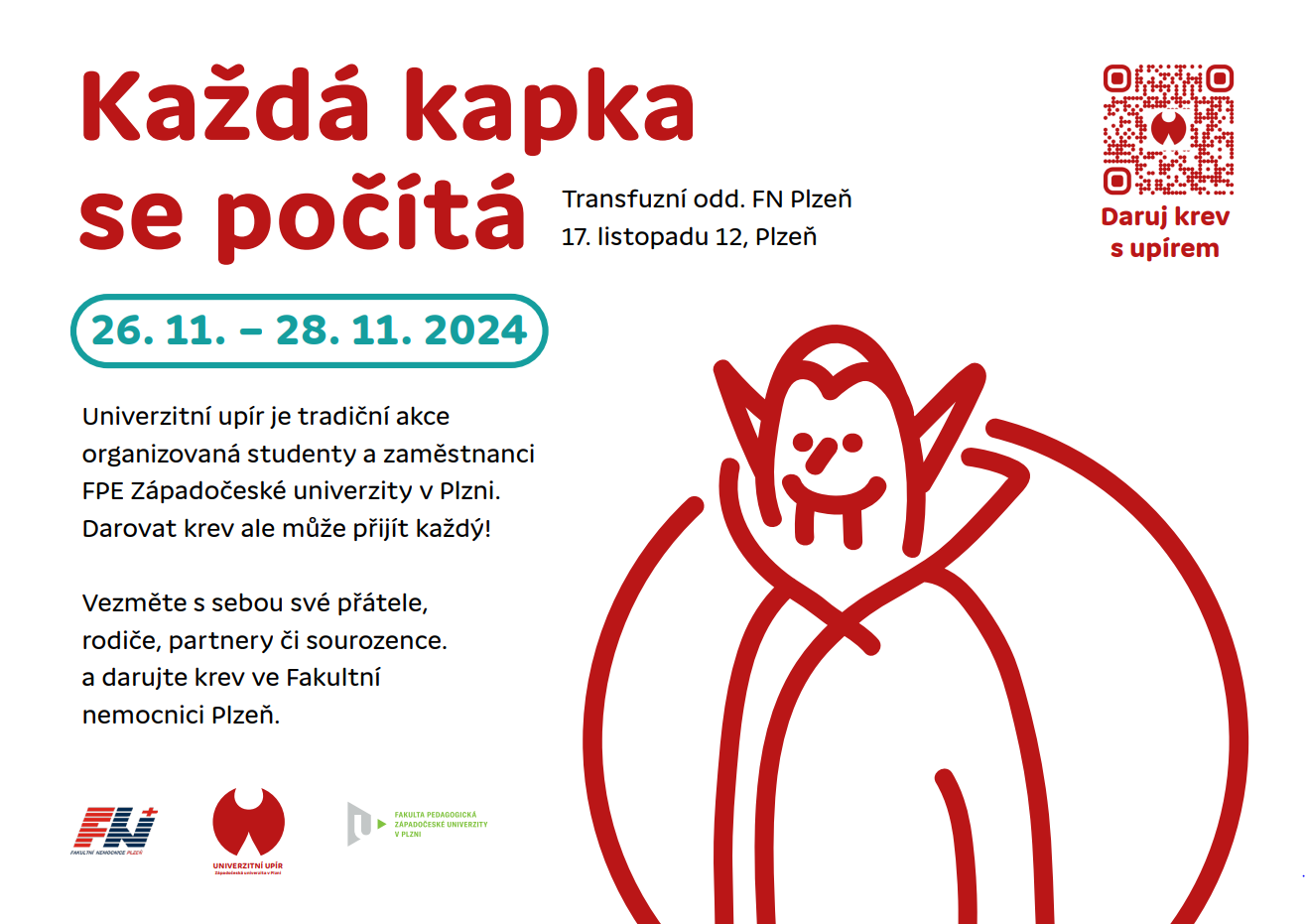 Univerzitní upír přilétne už koncem listopadu. Přijďte darovat krev i vy a podpořte tradiční akci, která pomáhá zachraňovat životy. Přijít můžete ve dnech 26. až 28. listopadu 2024.