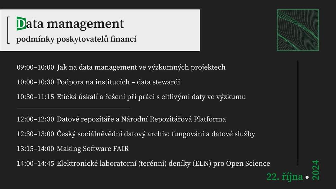 Připojte se od 21. do 23. října online a objevujte svět otevřené vědy – naplnění požadavků grantových agentur pak již bude hračka. Celý program Open Science Week 2024 si můžete prohlédnout na stránkách AKVŠ. Pro účast na přednáškách je nezbytné se registrovat.