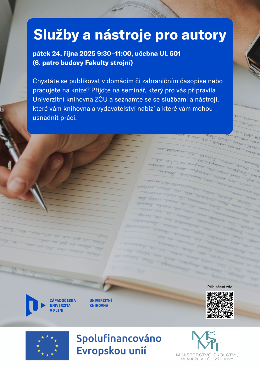 Více informací na https://czv.zcu.cz/Kurz/sluzby-a-nastroje-pro-autory-co-muze-nabidnout-univerzitni-knihovna-a-vydavatelstvi/