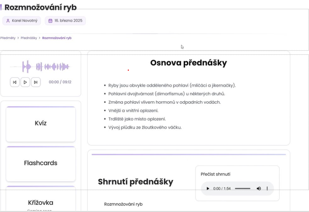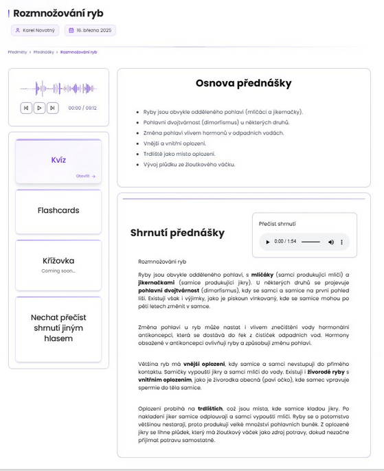 Currently, the basic source of information is an mp3 audio recording of the lecture, from which the system creates a text summary and other materials. Still, in the future, the application's authors are considering expanding it to include other data sources. "The lecture should ideally be recorded in a quiet environment so that the teacher's voice can be clearly heard and the technology can correctly identify what the teacher is talking about. However, modern speech-to-text technologies can cope with a certain noise level," added Lukáš.