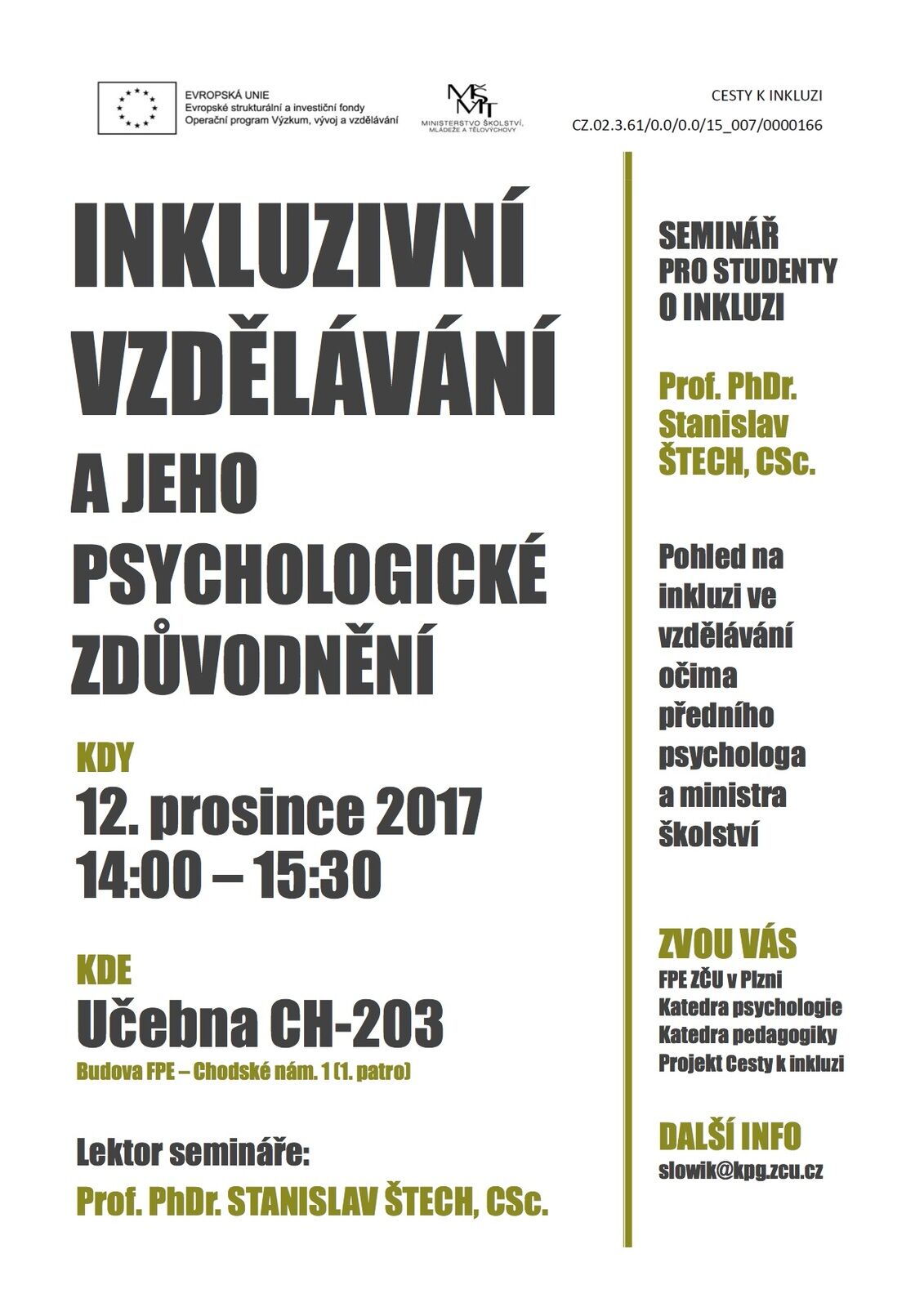 Seminář určený především pro studenty učitelských oborů bude tentokrát zaměřen na téma Inkluzivní vzdělávání a jeho psychologické zdůvodnění. Hostujícím lektorem bude dosavadní ministr školství, mládeže a tělovýchovy Stanislav Štech.