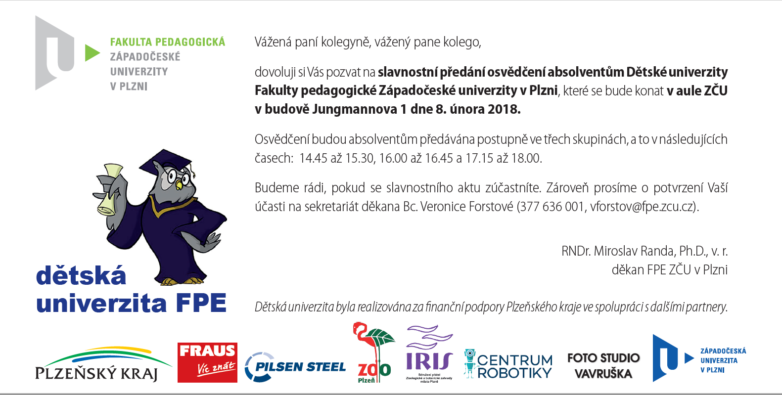 „Žákům základních škol umožňujeme touto formou seznámit se s vysokoškolským prostředím. Prostřednictvím praktických a tvůrčích aktivit se učí dívat se na svět zvídavě, klást si otázky a vlastní činností na ně nacházet odpovědi. Dětská univerzita je určena nejen žákům 2. stupně základních škol, ale také žákům 1. stupně, pro které je nabídka kroužků a zájmových aktivit malá. Věříme, že se s účastníky za několik let setkáme jako se studenty některé z fakult Západočeské univerzity," říká děkan pedagogické fakulty Miroslav Randa.