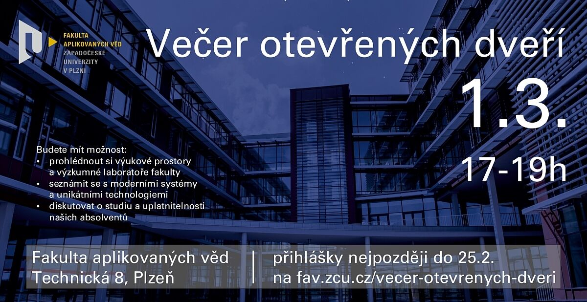 Na čtvrtek 1. března připravila Fakulta aplikovaných věd (FAV) Západočeské univerzity v Plzni Večer otevřených dveří. Od 17 do 19 hodin zpřístupní výukové prostory a vybrané laboratoře ve své budově v Technické ul. 8.