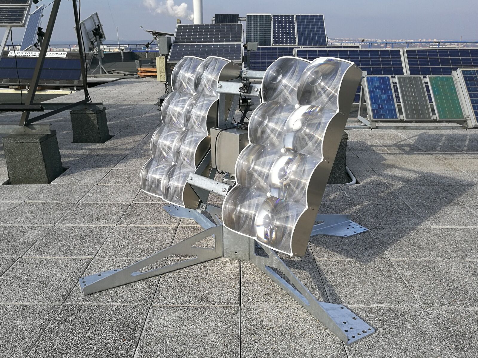 Velkoplošný čip z křemíku, používaný v běžných solárních článcích, nahrazuje koncentrovaná fotovoltaika čipem z materiálu na bázi sloučenin galia a arsenu o rozměrech 7x7 milimetrů umístěným pouze lokálně, a to pod optickou čočku velkou 25x25 cm, která 820krát koncentruje sluneční záření. Díky sledovači slunečního záření se panel s koncentrovanou fotovoltaikou natáčí za sluncem, a záření tak dopadá vždy na čočku. Akceptační úhel ještě zvyšuje sekundární optika, která odráží sluneční záření tak, aby směřovalo přesně do přijímače. Umístěna je mezi modulem a hlavní čočkou. „Křemík je strategický a poměrně drahý materiál. Jeho nahrazení optikou přináší materiálové i cenové úspory,“ upozorňuje Jan Řeboun na jednu z výhod koncentrované fotovoltaiky. Další výhodou je skutečnost, že dosahuje ve srovnání s konvenční fotovoltaikou dvojnásobné účinnosti, což je podle Jana Řebouna dáno využitím daleko sofistikovanějších čipů, obsahujících tři fotodiody, kdy každá sbírá jiné spektrum světla. Podmínkou efektivního využití koncentrované fotovoltaiky je však přímé sluneční záření. Systém je proto vhodný především do oblastí s velkým množstvím slunečných dnů.