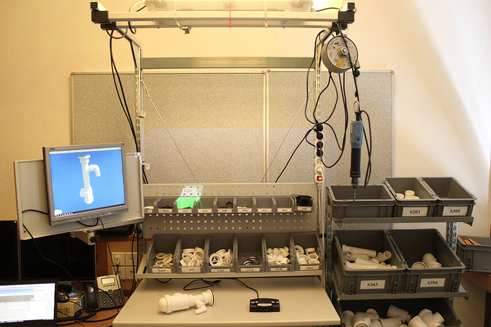 Na monitoru běží ve 3D pracovní postup zaměřený například na sestavení sifonu do umyvadel. Pracovník sleduje video s animovanou návodkou a současně se u jeho pracovní plochy dataprojektorem osvěcují zásobníky právě s těmi součástkami, které má pracovník v danou chvíli použít. Po každém kroku si ovladačem video posouvá. Tak se dá jednoduše popsat způsob, jak se pracuje s využitím virtuální animované 3D návodky odborníků z Fakulty strojní Západočeské univerzity.