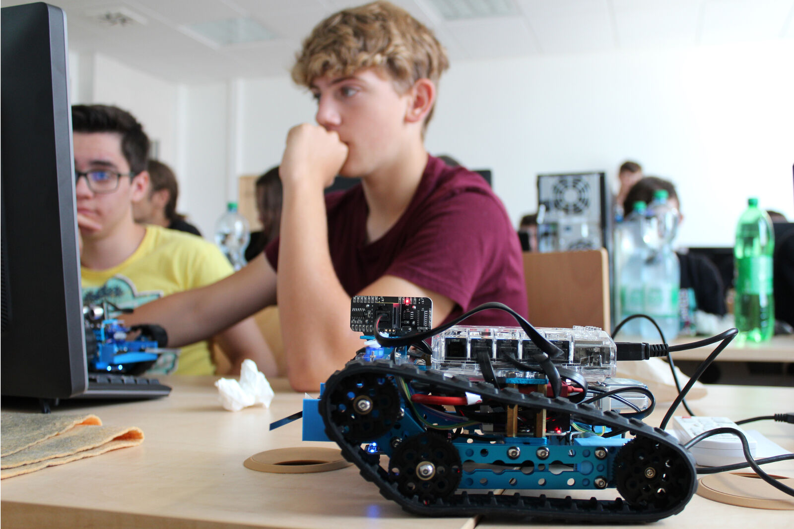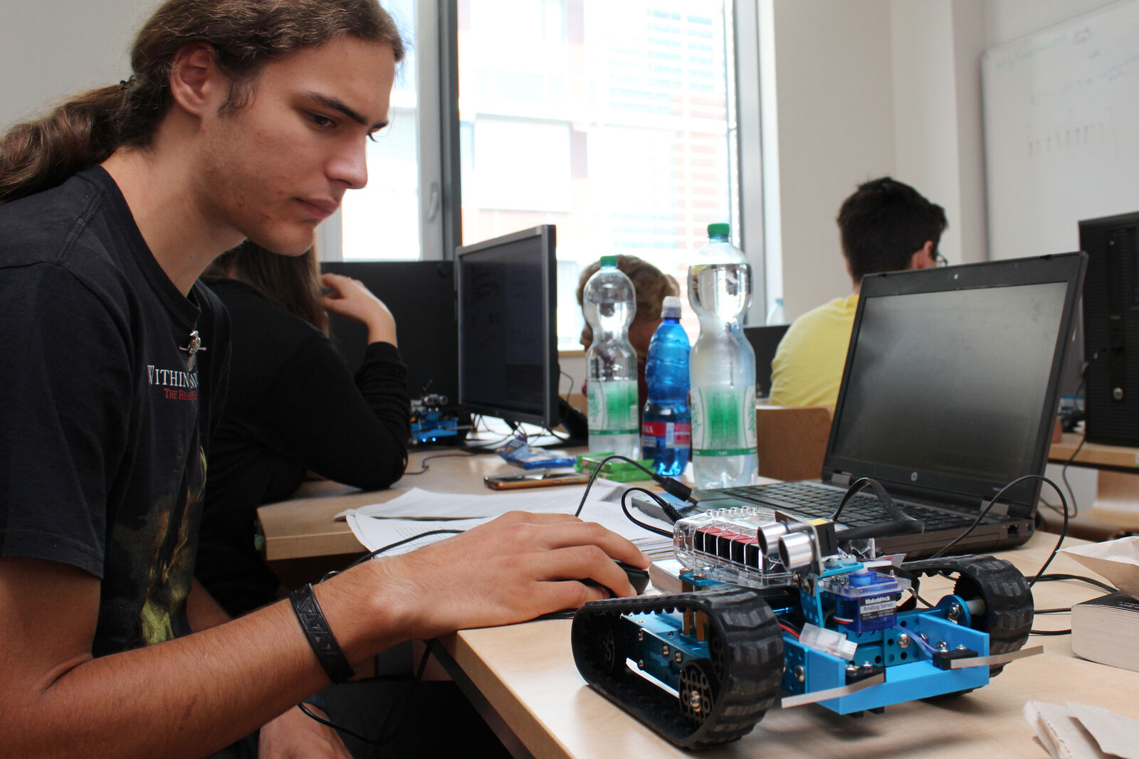 Ve dvou učebnách Fakulty aplikovaných věd je živo. Žáci sedí před monitory a programují roboty připojené k počítačům kabely, nebo klečí na podlaze a zkoušejí, jak se jim programování povedlo. Campo Arduino se koná teprve druhý den, takže jejich úkol je zatím poměrně jednoduchý. Robot musí prostě dojet na stanovenou značku a zastavit.