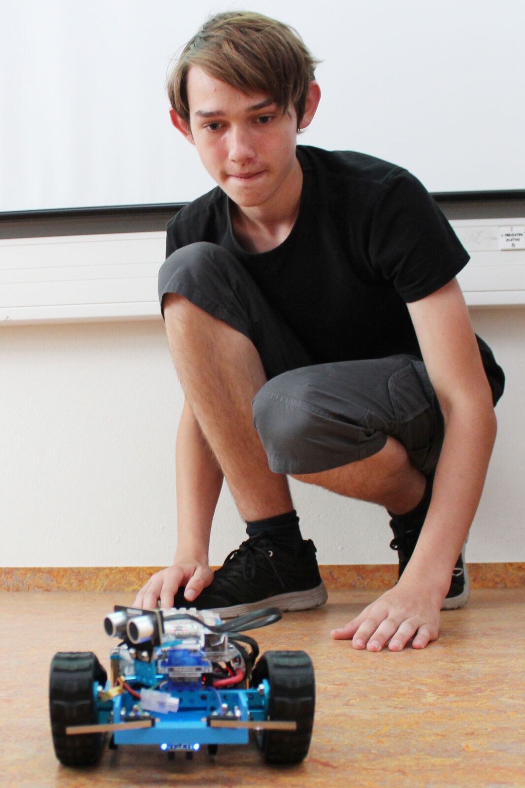 „Máme dva typy robotů, které dětem dáváme už sestavené. Jeden je kolový, druhý pásový, přičemž kolový je pro mladší kategorii, protože se jednodušeji ovládá. Pásový robot už disponuje širší škálou čidel a senzorů a je to novinka vlastně i pro nás pořadatele. Letos ho tady máme poprvé a vymýšlíme pro něj nové hry. Starší děti s ním pracují i proto, že některé z nich jsou u nás už poněkolikáté a kolového dobře znají,“ pokračuje Miroslav Jiřík.