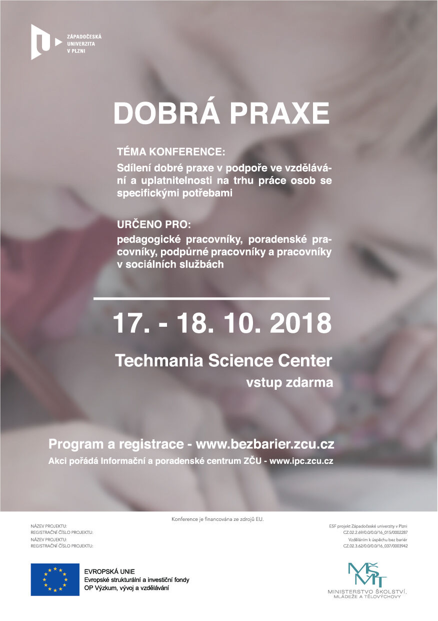 Konference je financována z evropských projektů: ESF Projekt Západočeské univerzity v Plzni (CZ.02.2.69/0.0/0.0/16_015/0002287) a Vzděláním k úspěchu bez bariér (CZ.02.3.62/0.0/0.0/16_037/0003942).