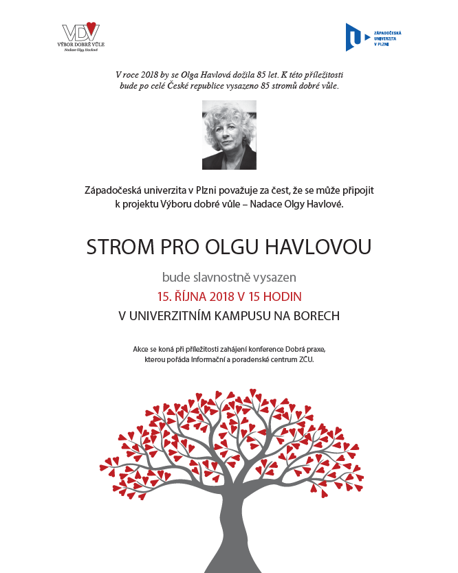 Už v pondělí 15. října v 15 hodin bude v kampusu univerzity vysazen strom, který připomene osobnost Olgy Havlové, zakladatelky Výboru Dobré vůle, která by se letos dožila 85 let. V roce 1993 zasadila Olga Havlová v Olomouci v prostorách dětského centra „lípu dobré vůle“. Strom v areálu Západočeské univerzity bude jedním z 85 po celé České republice, již mají uctít tuto mimořádnou ženu, která nikdy nebyla lhostejná k potřebám lidí jakkoliv znevýhodněných.