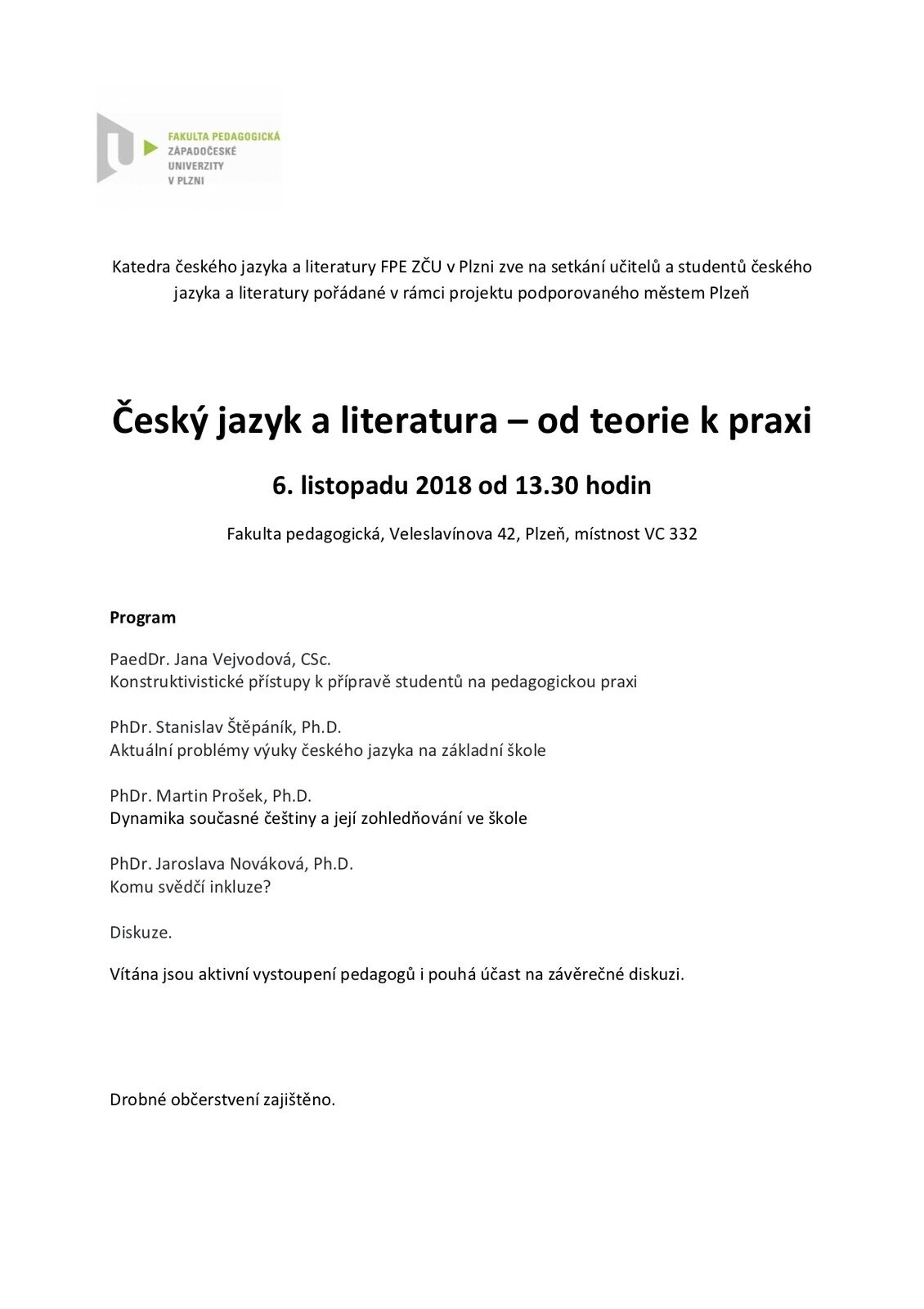Katedra českého jazyka a literatury Fakulty pedagogické Západočeské univerzity pořádá akci pro studenty a učitele.
