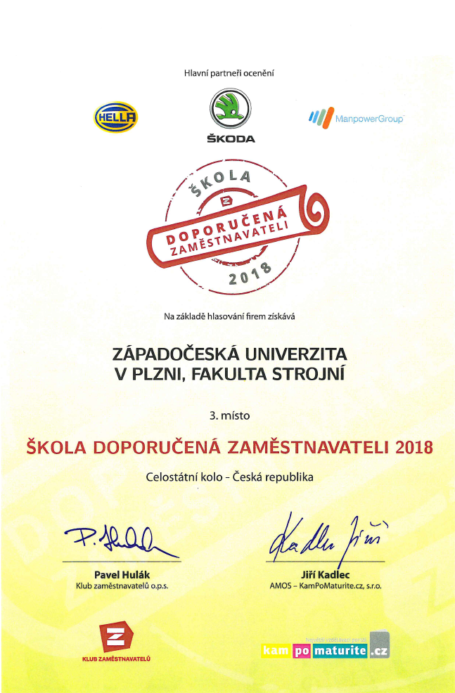 V rámci této soutěže doporučují zaměstnavatelé jednotlivé fakulty vysokých škol z celé republiky a střední školy ve vybraných regionech. Fakulta strojní Západočeské univerzity v Plzni se umístila na 3. místě v kategorii fakulta doporučená zaměstnavateli. Cenu převzal v Betlémské kapli proděkan pro spolupráci s praxí Jan Zdebor.