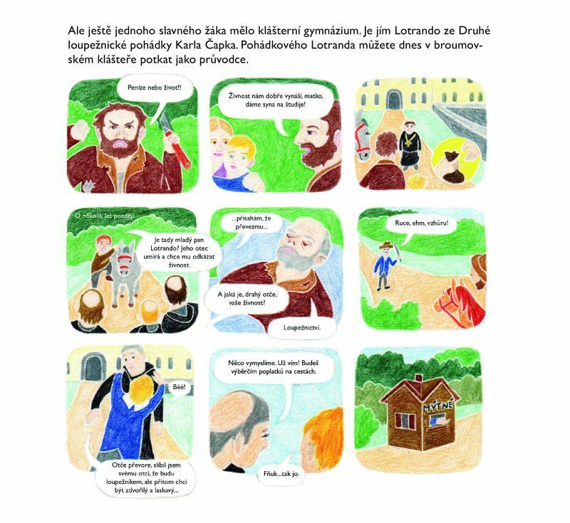 Osm bohatě ilustrovaných kapitol s prvky komiksu a jednou prostorovou ilustrací seznamuje čtenáře s jednotlivými etapami vývoje kláštera od jeho založení až po současnost. Hravá forma, pevný papír a barevná kroužková vazba činí publikaci přístupnou a zároveň odolnou i nejmladším čtenářům. Nejen oni, ale i jejich rodiče, se po začtení a zakoukání se do kouzelných ilustrací mohou dozvědět co je to škapulíř, kde bylo v broumovském klášteře ukryté Turínské plátno, nebo co musel překonávat Alois Jirásek, když chodil do školy.