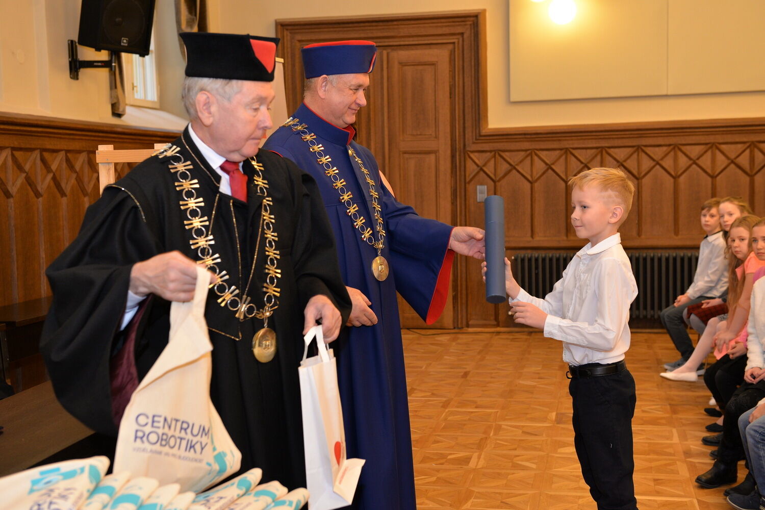 Slavnostní ceremoniál, při kterém děti převzaly z rukou děkana Fakulty pedagogické ZČU Miroslava Randy osvědčení o absolvování, se uskutečnil v aule fakulty ve Veleslavínově ulici 42.