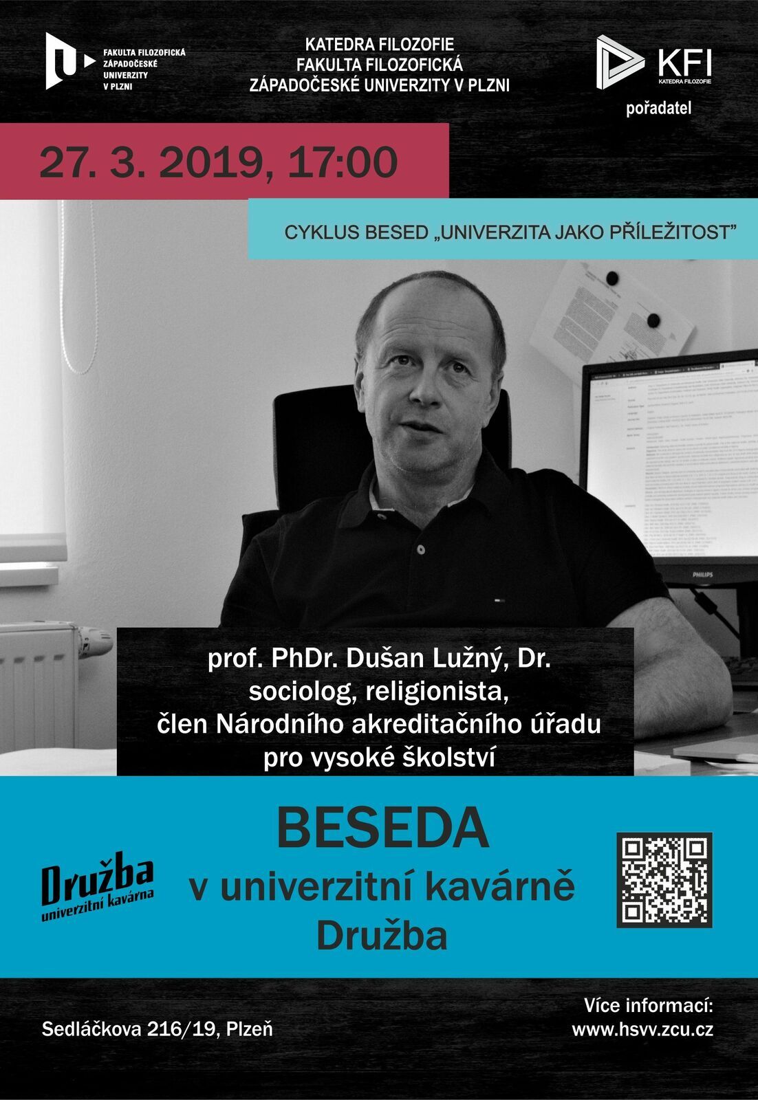 Beseda nazvaná “Univerzita jako příležitost… pochopit její fungování” s Dušanem Lužným, sociologem a členem Národního akreditačního úřadu pro vysoké školství, provede (nejen) studenty zákulisím univerzitního vzdělávání. Profesor Lužný promluví o svých zkušenostech z Národního akreditačního úřadu, vysvětlí význam a fungování akreditačního procesu, zamyslí se nad současnou úrovní vysokých škol, kvalitou vědy a vysokoškolského vzdělávání a zároveň osvětlí, v čem spatřuje pozitiva, ale i problémy humanitních a společenských věd.