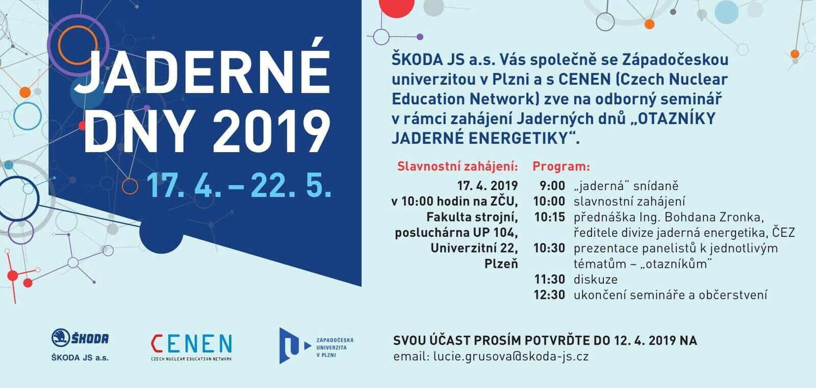 Západočeská univerzita v Plzni, ŠKODA JS a. s. a CENEN pořádají Jaderné dny 2019 za podpory Doosan Škoda Power s.r.o., ČEZ a. s., ÚJV Řež a. s. a dalších. Účast na letošním ročníku Jaderných dnů přislíbily i zahraniční společnosti ATMEA (francouzsko-japonské konsorcium firem Areva a Mitsubishi Heavy Industries), KHNP (Korea Hydro & Nuclear Power Co., Ltd., Jižní Korea), JAVYS (Jadrová a vyraďovacia společnosť a.s.) a další.